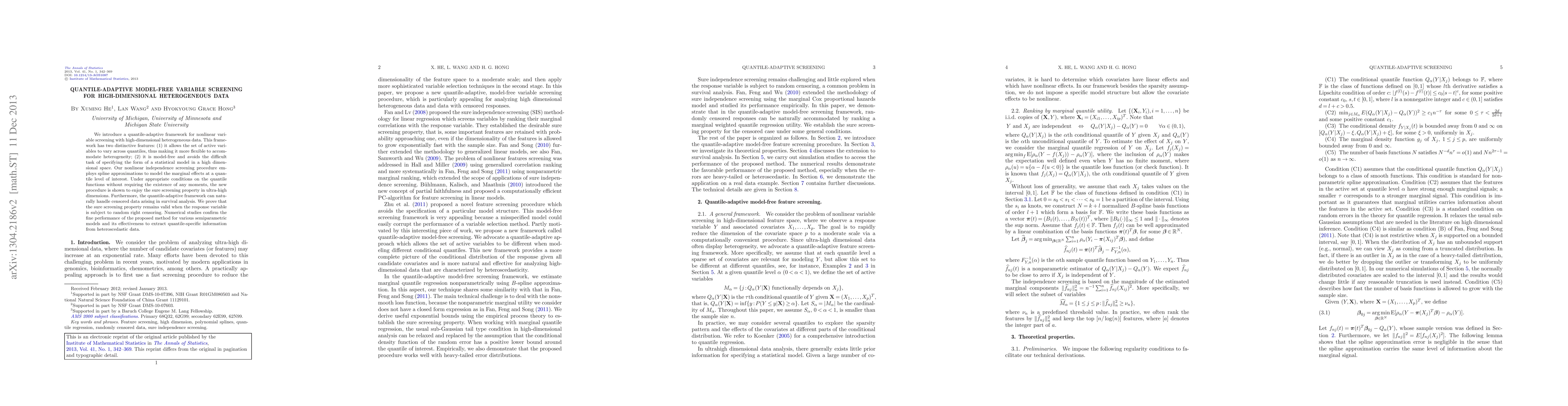 This paper introduces a quantile-adaptive framework for model-free variable screening in high-dimensional heterogeneous data, allowing active variable sets to vary across quantiles and employing spline approximations for marginal effects. The method ensures the sure screening property in ultra-high dimensions and effectively handles censored data in survival analysis.