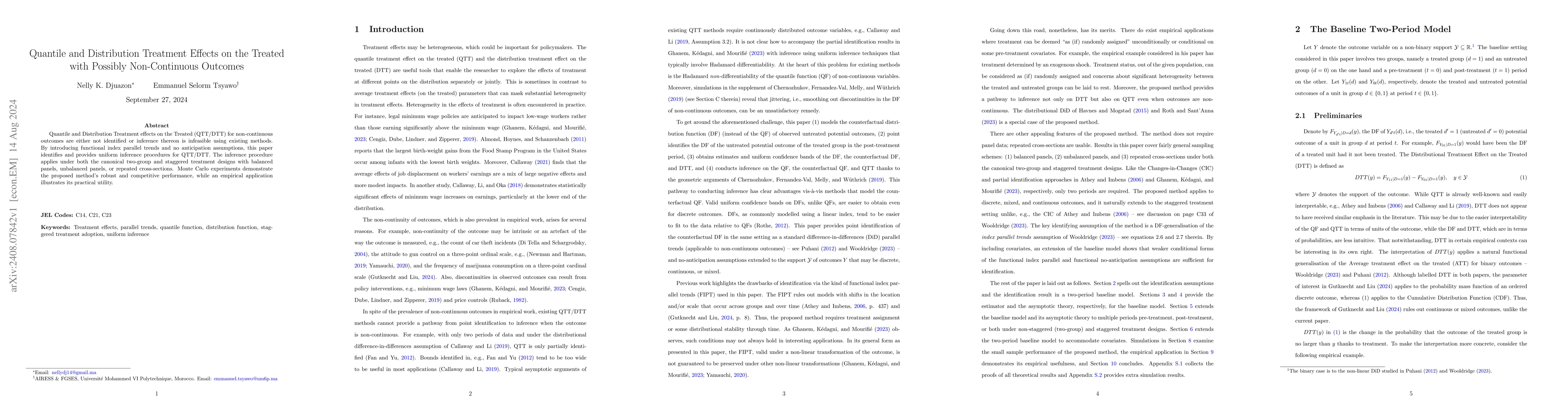 This paper introduces novel methods for identifying and uniformly inferring quantile and distribution treatment effects on the treated (QTT/DTT) for non-continuous outcomes, leveraging functional index parallel trends and no anticipation assumptions. The proposed inference procedure is robust and performs well in both theoretical simulations and empirical applications.