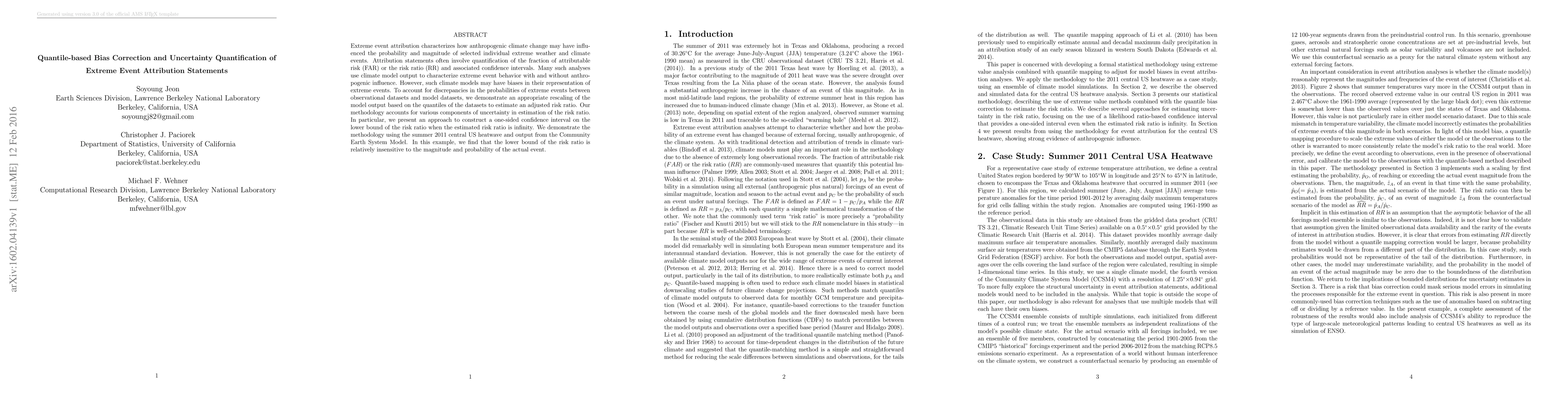 This paper proposes a quantile-based method to correct biases in climate models for extreme event attribution, demonstrating its application to the 2011 US heatwave, and introduces a novel approach to quantify uncertainty in risk ratio estimates, particularly when the ratio is infinite.