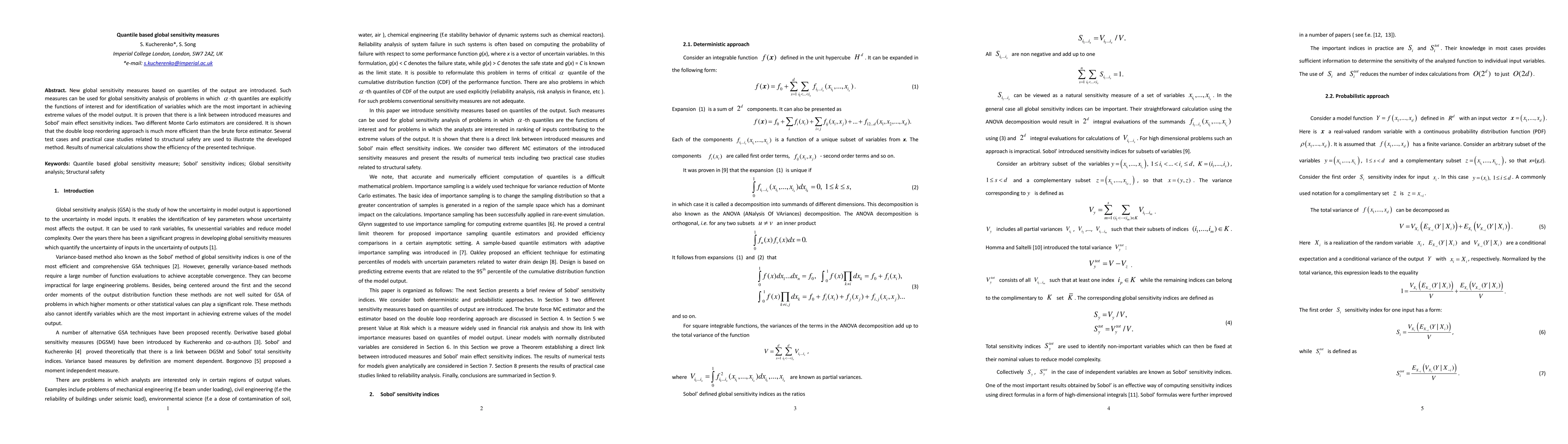 This paper introduces new global sensitivity measures based on output quantiles, linking them to Sobol main effect indices, and demonstrates their efficiency using Monte Carlo estimators, particularly the double loop reordering approach. The method is illustrated through structural safety case studies, showing its effectiveness in identifying key variables for extreme model outputs.