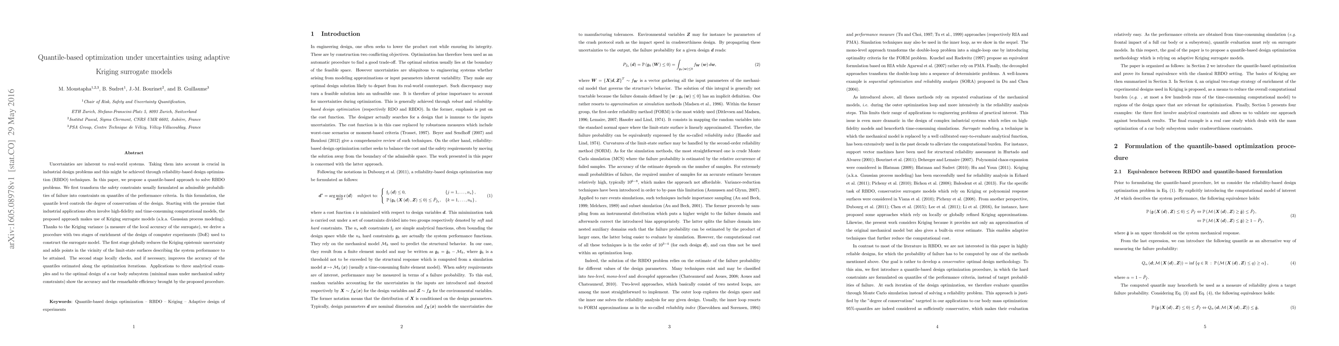 This paper proposes a quantile-based optimization method for reliability-based design optimization (RBDO) using adaptive Kriging surrogate models to handle uncertainties. The approach transforms safety constraints into quantile constraints, enhancing design conservatism control, and employs adaptive Kriging to efficiently manage high-fidelity models, demonstrating accuracy and efficiency through analytical examples and a car body subsystem design.