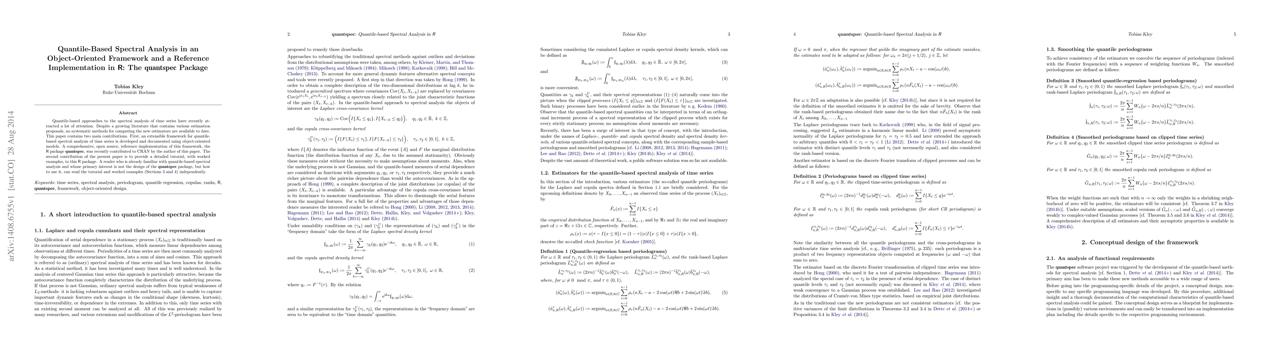 Quantile-based approaches to the spectral analysis of time series have recently attracted a lot of attention. Despite a growing literature that contains various estimation proposals, no systematic methods for computing the new estimators are available to date. This paper contains two main contributions. First, an extensible framework for quantile-based spectral analysis of time series is developed and documented using object-oriented models. A comprehensive, open source, reference implementation of this framework, the R package quantspec, was recently contributed to CRAN by the author of this paper. The second contribution of the present paper is to provide a detailed tutorial, with worked examples, to this R package. A reader who is already familiar with quantile-based spectral analysis and whose primary interest is not the design of the quantspec package, but how to use it, can read the tutorial and worked examples (Sections 3 and 4) independently.