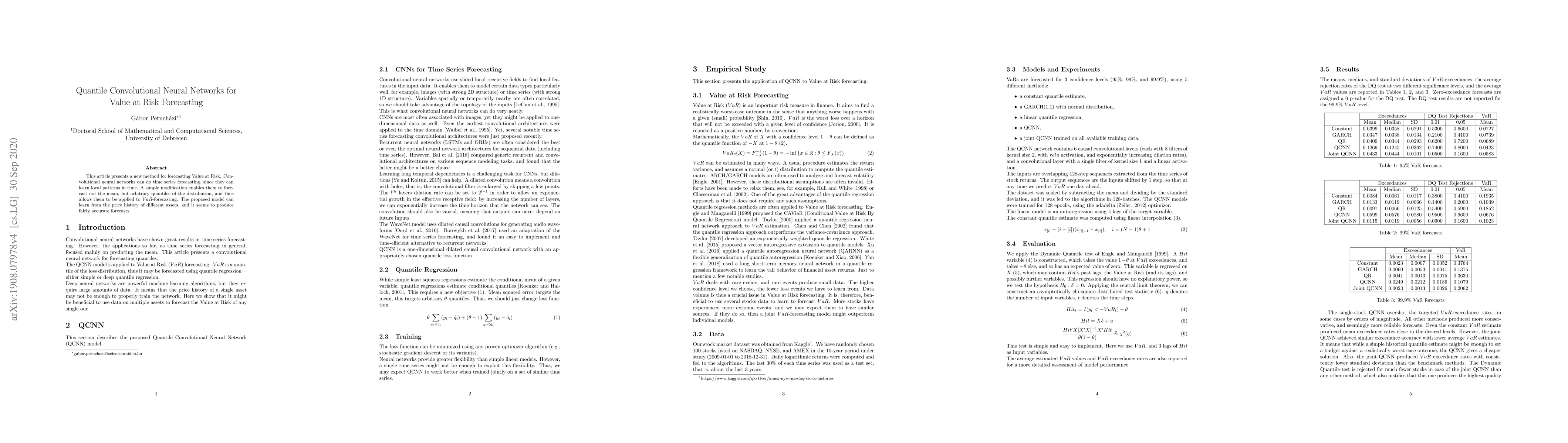 This paper introduces a modified convolutional neural network for Value at Risk (VaR) forecasting by enabling it to predict arbitrary quantiles, rather than just the mean. The model demonstrates accurate forecasts based on the price history of various assets.