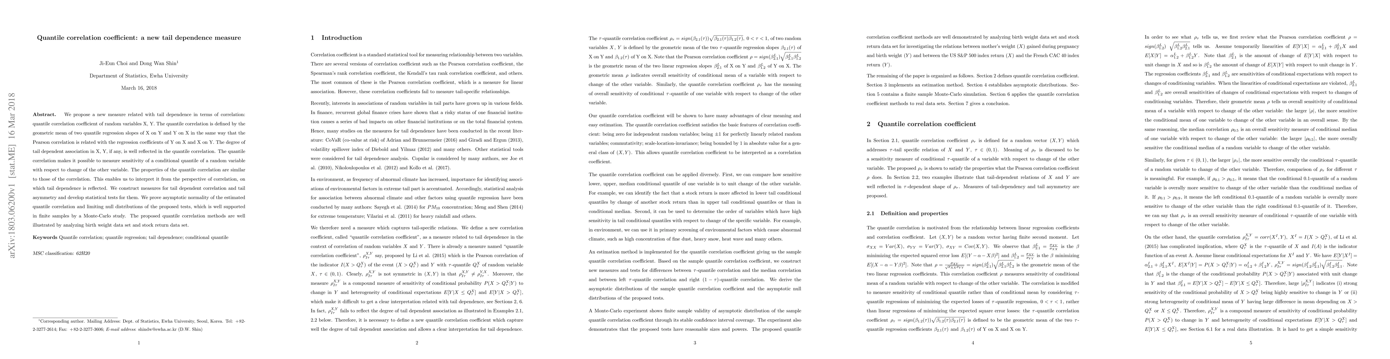 This paper introduces a new quantile correlation coefficient to measure tail dependence between random variables, defined via geometric mean of quantile regression slopes. It provides statistical tests and demonstrates its applicability through analysis of birth weight and stock return datasets.