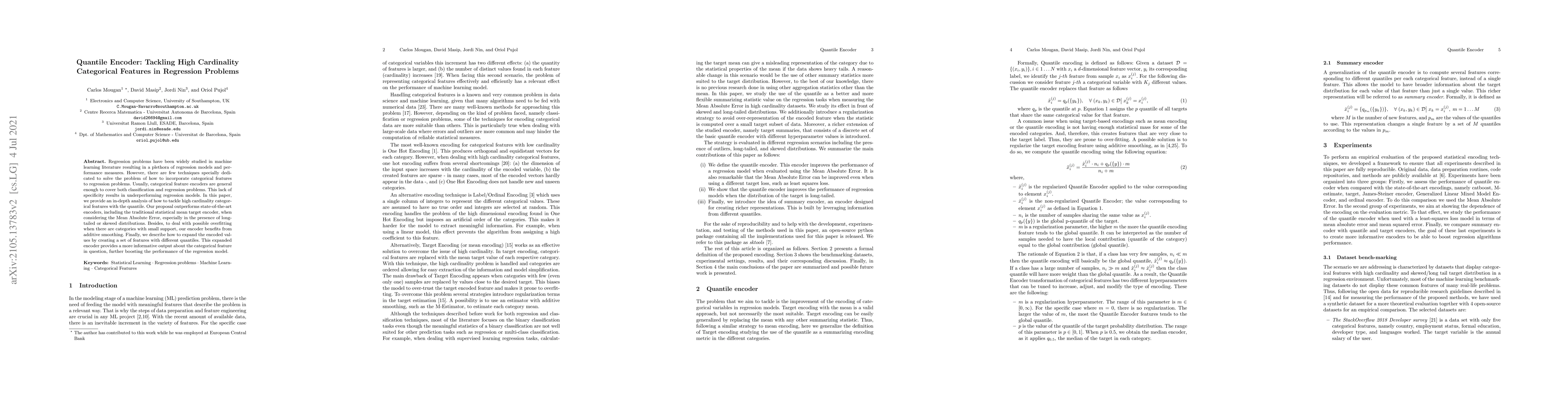 This paper introduces a Quantile Encoder to effectively handle high cardinality categorical features in regression problems, outperforming traditional encoders in Mean Absolute Error, especially with skewed distributions. It also incorporates additive smoothing to mitigate overfitting and expands encoded values using quantiles for enhanced regression model performance.