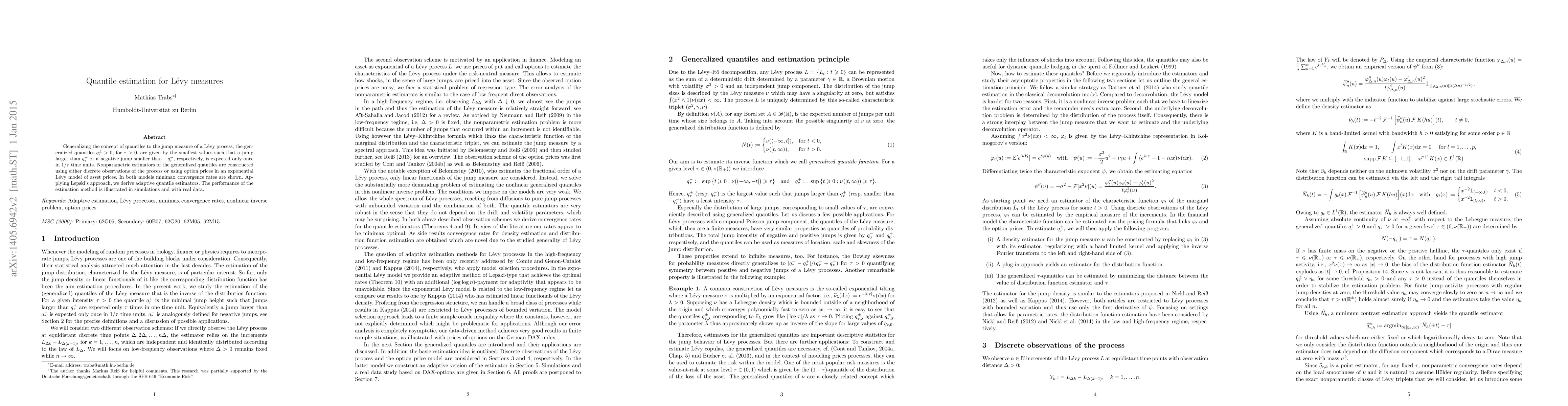 Generalizing the concept of quantiles to the jump measure of a L\'evy process, the generalized quantiles $q_{\tau}^{\pm}>0$, for $\tau>0$, are given by the smallest values such that a jump larger than $q_{\tau}^{+}$ or a negative jump smaller than $-q_{\tau}^{-}$, respectively, is expected only once in $1/\tau$ time units. Nonparametric estimators of the generalized quantiles are constructed using either discrete observations of the process or using option prices in an exponential L\'evy model of asset prices. In both models minimax convergence rates are shown. Applying Lepski's approach, we derive adaptive quantile estimators. The performance of the estimation method is illustrated in simulations and with real data.