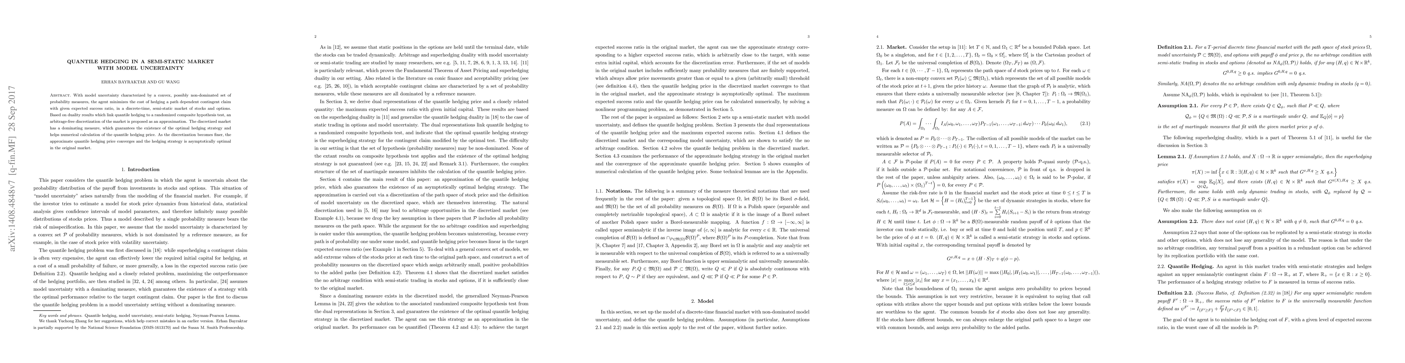 This paper explores quantile hedging in a semi-static market with model uncertainty, proposing an arbitrage-free discretization method to approximate the optimal hedging strategy. The discretization ensures the existence of the optimal strategy and facilitates numerical computation, with convergence and asymptotic optimality as the discretization becomes finer.