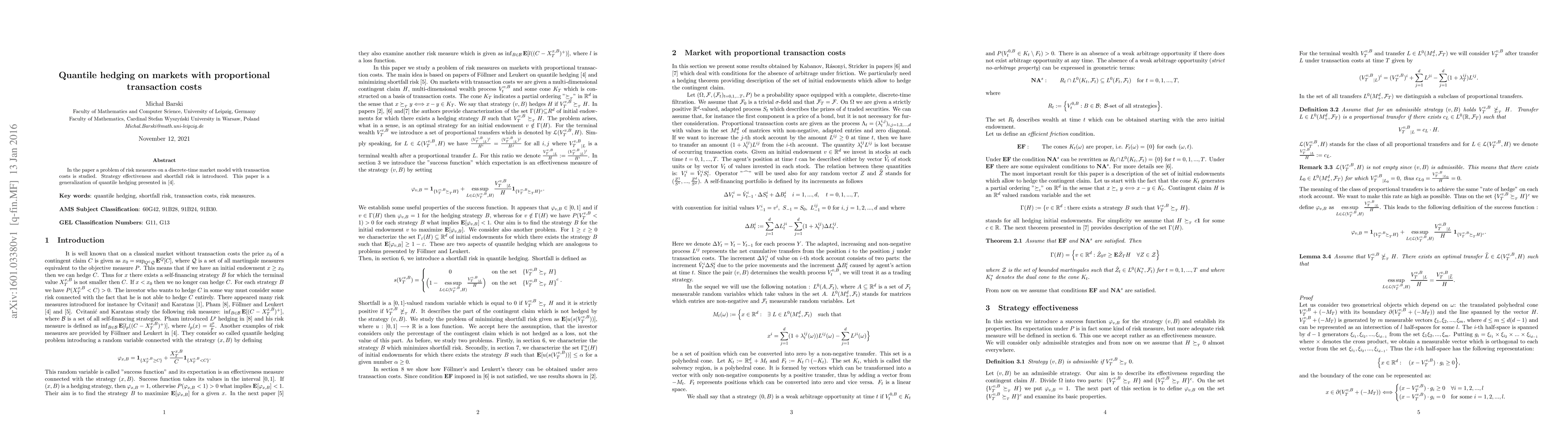 Summary: This paper generalizes quantile hedging to a discrete-time market model with proportional transaction costs, introducing strategy effectiveness and shortfall risk measures to evaluate hedging performance.