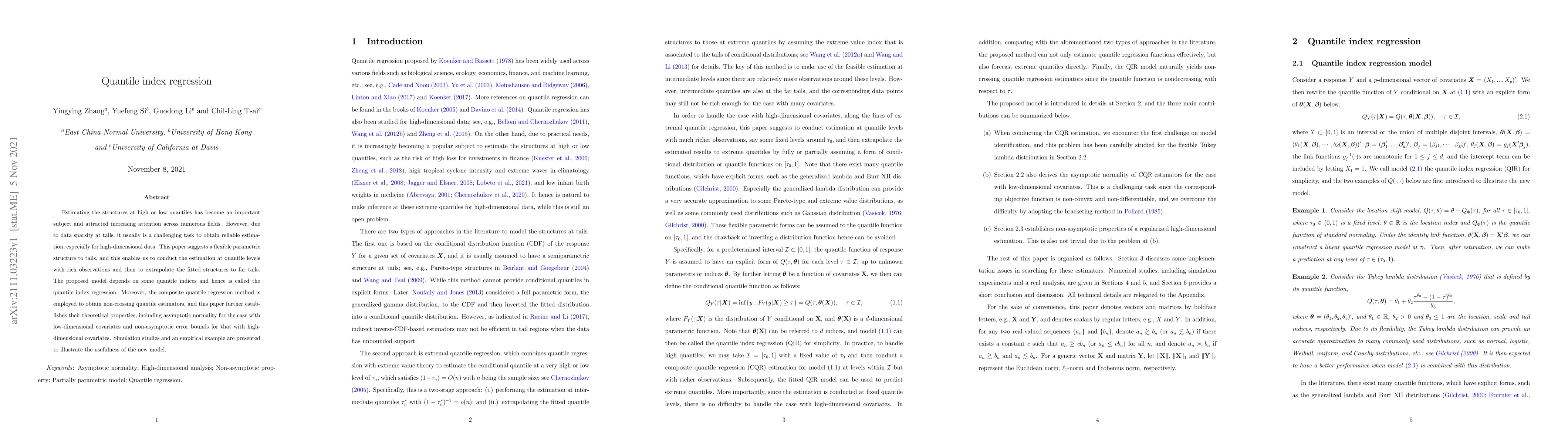 This paper proposes a quantile index regression model to estimate structures at high or low quantiles, addressing the challenge of data sparsity in high-dimensional data. The model uses quantile indices and composite quantile regression to ensure non-crossing estimators, with theoretical properties established for both low- and high-dimensional covariates.