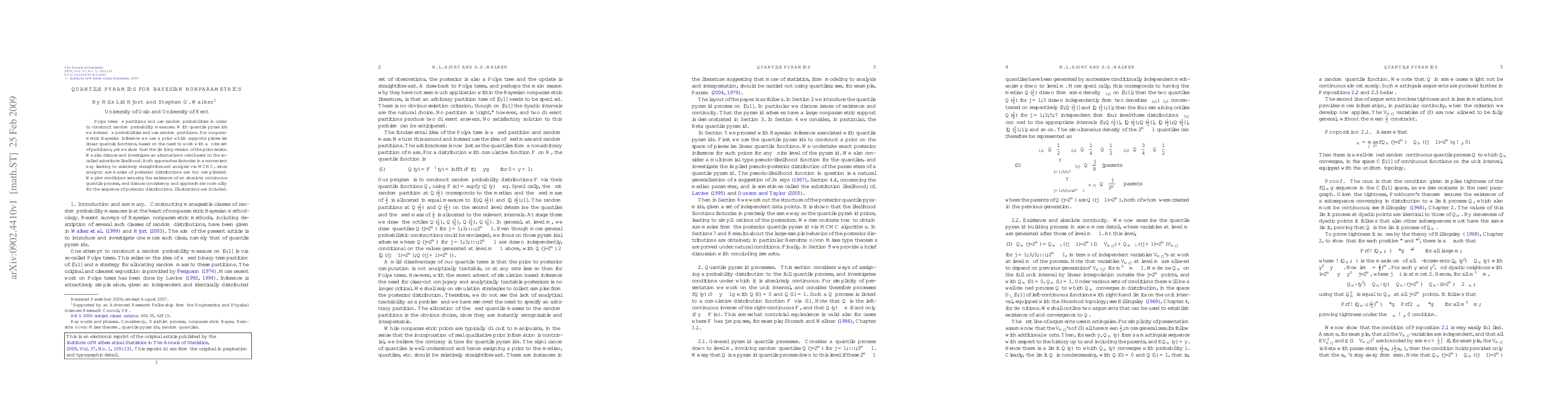 This paper introduces quantile pyramids for Bayesian nonparametrics, contrasting them with Pólya trees by fixing probabilities and using random partitions. It proposes a prior that supports piecewise linear quantile functions, demonstrating the existence of a limiting version and discussing an alternative model based on substitute likelihood. The approaches facilitate straightforward MCMC analysis and provide conditions for the existence of an absolutely continuous quantile process, along with consistency and approximate normality of posterior distributions.