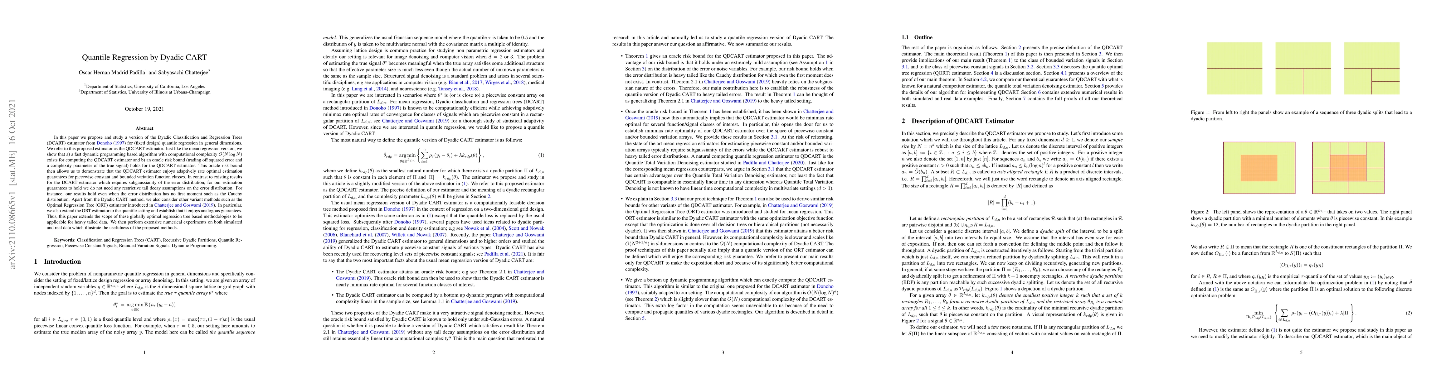 This paper proposes a QDCART estimator for quantile regression, demonstrating its computational efficiency and adaptive estimation guarantees without restrictive error distribution assumptions. It also extends the Optimal Regression Tree (ORT) estimator to quantile settings and validates the methods through numerical experiments on both simulated and real data.