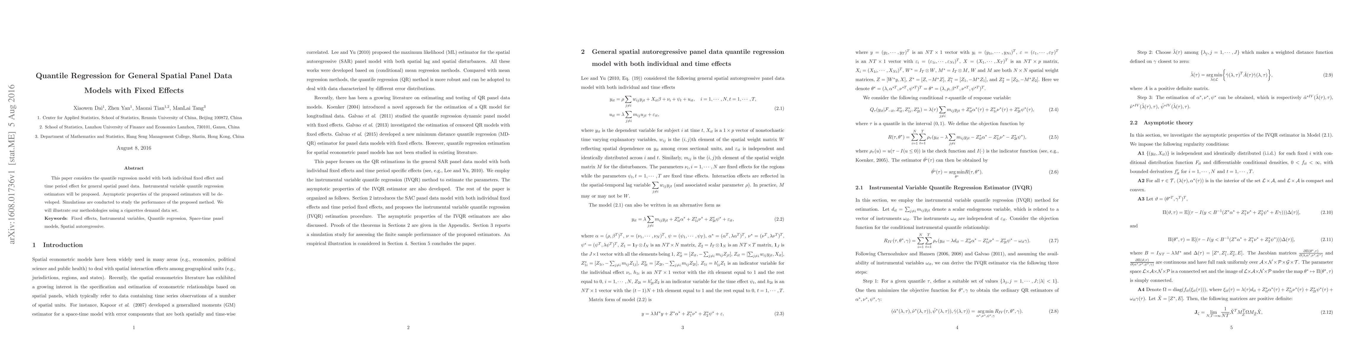 This paper considers the quantile regression model with both individual fixed effect and time period effect for general spatial panel data. Instrumental variable quantile regression estimators will be proposed. Asymptotic properties of the proposed estimators will be developed. Simulations are conducted to study the performance of the proposed method. We will illustrate our methodologies using a cigarettes demand data set.