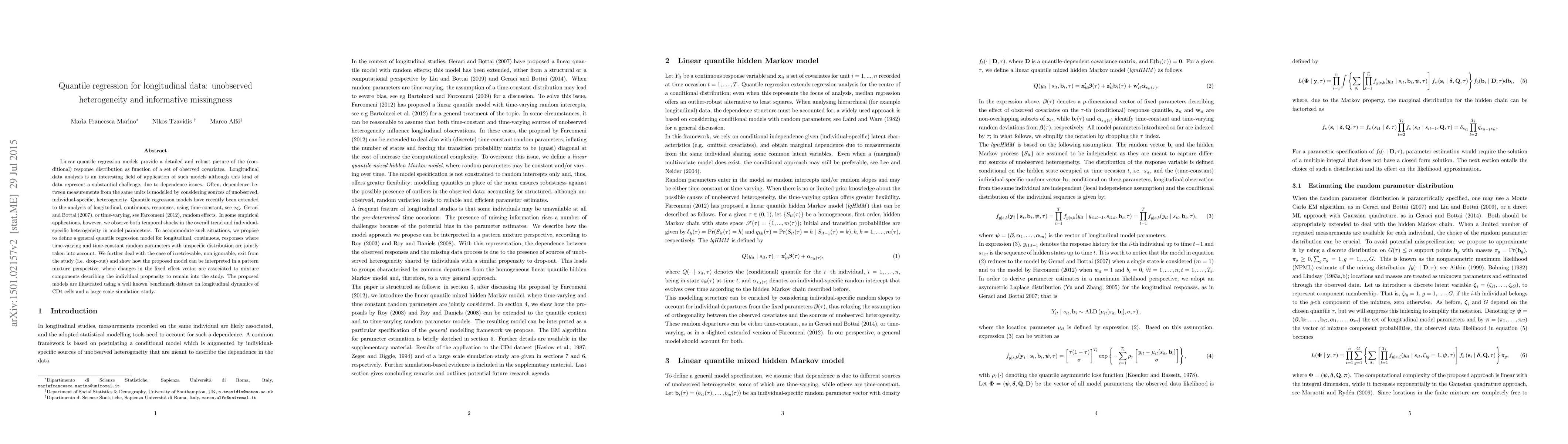 This paper proposes a quantile regression model for longitudinal data that incorporates both time-varying and time-constant random effects to account for unobserved heterogeneity. It also addresses informative missingness due to dropout, introducing a pattern mixture version of the linear quantile hidden Markov model to handle irretrievable drop-out, illustrated with a CD4 cells dataset and validated through simulation studies.