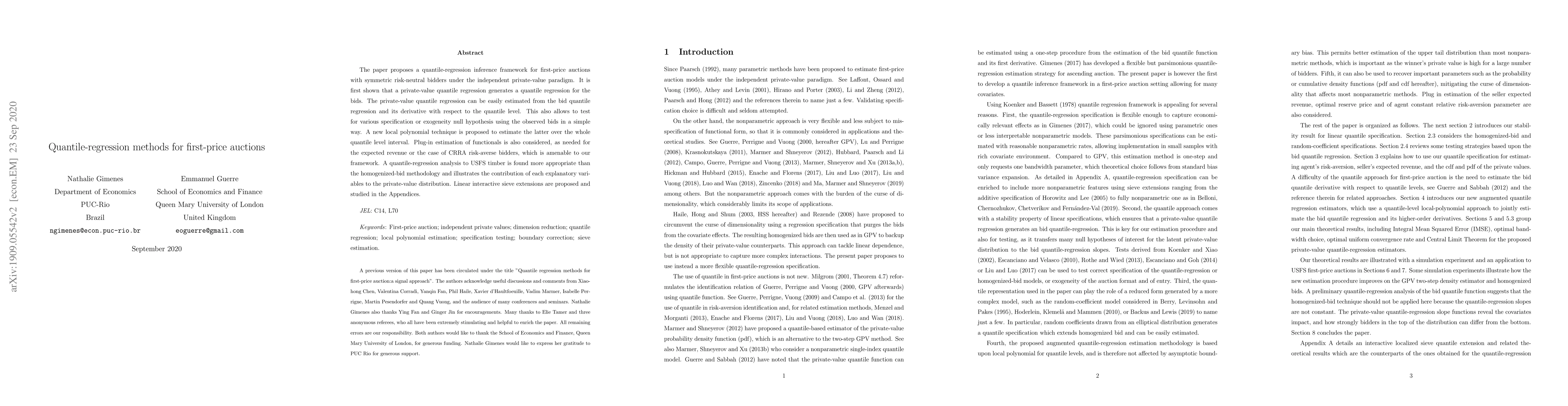 The paper proposes a quantile-regression inference framework for first-price auctions with symmetric risk-neutral bidders under the independent private-value paradigm. It is first shown that a private-value quantile regression generates a quantile regression for the bids. The private-value quantile regression can be easily estimated from the bid quantile regression and its derivative with respect to the quantile level. This also allows to test for various specification or exogeneity null hypothesis using the observed bids in a simple way. A new local polynomial technique is proposed to estimate the latter over the whole quantile level interval. Plug-in estimation of functionals is also considered, as needed for the expected revenue or the case of CRRA risk-averse bidders, which is amenable to our framework. A quantile-regression analysis to USFS timber is found more appropriate than the homogenized-bid methodology and illustrates the contribution of each explanatory variables to the private-value distribution. Linear interactive sieve extensions are proposed and studied in the Appendices.