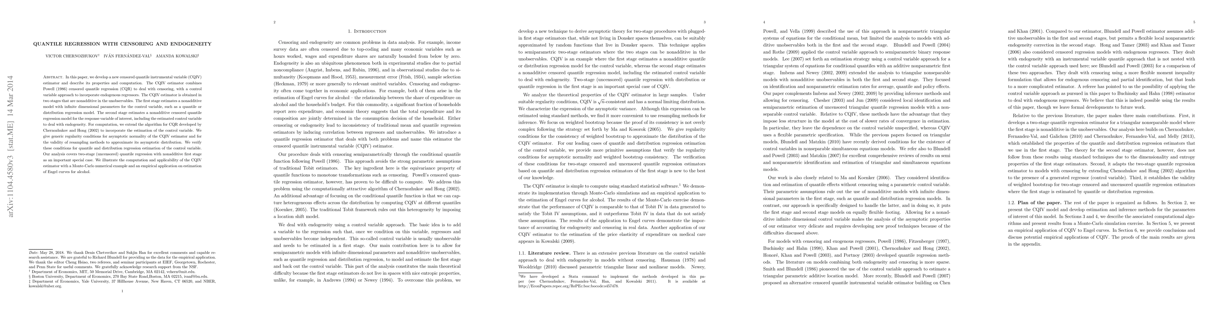 This paper introduces a new censored quantile instrumental variable (CQIV) estimator that combines censored quantile regression with a control variable approach to handle endogeneity. The CQIV estimator is computed in two stages and verified through Monte-Carlo simulations and an empirical application on alcohol Engel curves.