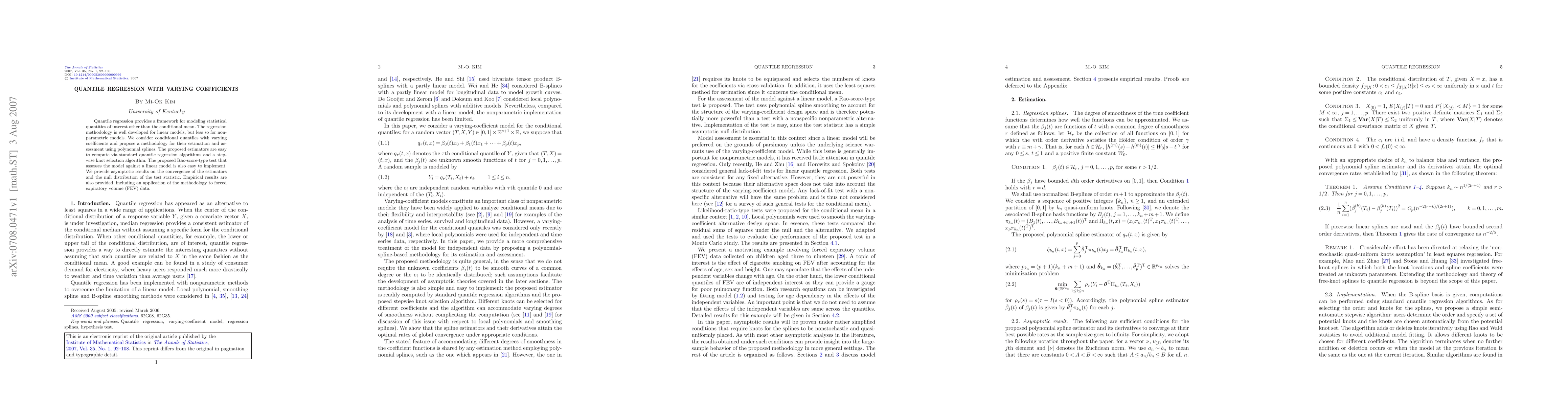 This paper proposes a methodology for estimating conditional quantiles with varying coefficients using polynomial splines in quantile regression. It introduces easy-to-compute estimators and a simple test to assess model fit against linear models, supported by asymptotic results and empirical application.