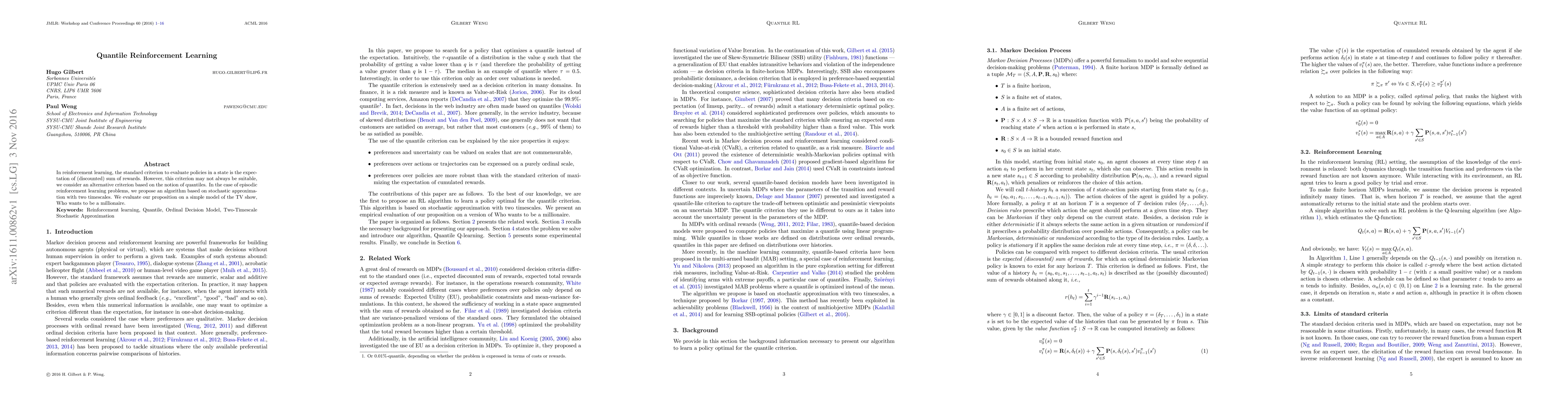 Title: Quantile Reinforcement Learning Summary: This paper proposes an alternative quantile-based criterion for evaluating reinforcement learning policies, introducing a two-timescale stochastic approximation algorithm for episodic reinforcement learning problems, and evaluates it using a simplified model of "Who Wants to Be a Millionaire."