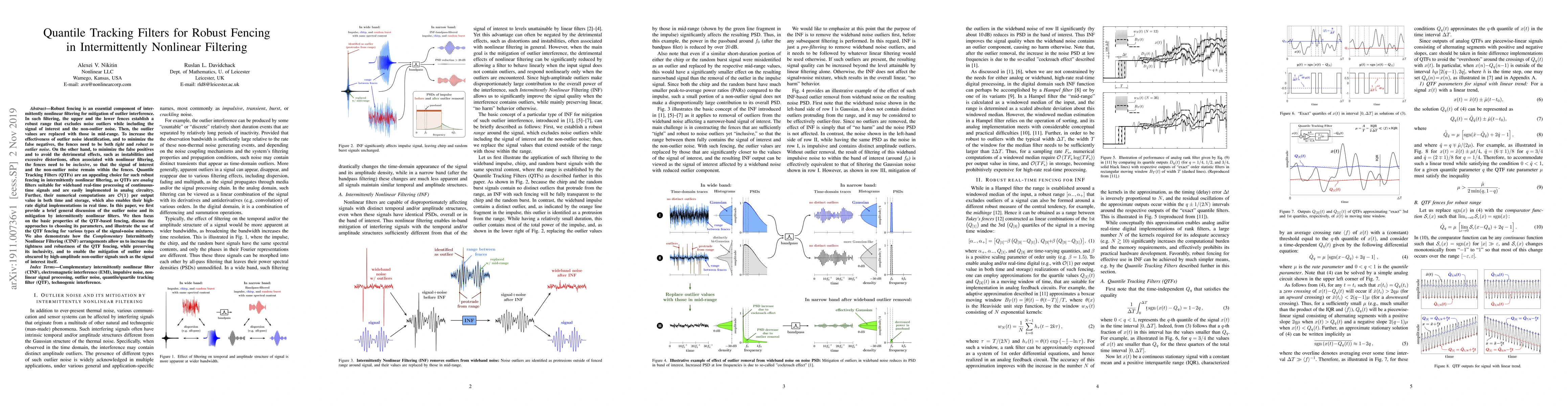 Robust fencing is an essential component of intermittently nonlinear filtering for mitigation of outlier interference. In such filtering, the upper and the lower fences establish a robust range that excludes noise outliers while including the signal of interest and the non-outlier noise. Then, the outlier values are replaced with those in mid-range. To increase the effectiveness of outlier noise identification, and to minimize the false negatives, the fences need to be both tight and robust to outlier noise. On the other hand, to minimize the false positives and to avoid the detrimental effects, such as instabilities and excessive distortions, often associated with nonlinear filtering, the fences need to be inclusive, so that the signal of interest and the non-outlier noise remain within the fences. Quantile Tracking Filters (QTFs) are an appealing choice for such robust fencing in intermittently nonlinear filtering, as QTFs are analog filters suitable for wideband real-time processing of continuous-time signals and are easily implemented in analog circuitry. Further, their numerical computations are O(1) per output value in both time and storage, which also enables their high-rate digital implementations in real time. In this paper, we first provide a brief general discussion of the outlier noise and its mitigation by intermittently nonlinear filters. We then focus on the basic properties of the QTF-based fencing, discuss the approaches to choosing its parameters, and illustrate the use of the QTF fencing for various types of the signal+noise mixtures. We also demonstrate how the Complementary Intermittently Nonlinear Filtering (CINF) arrangements allow us to increase the tightness and robustness of the QTF fencing, while preserving its inclusivity, and to enable the mitigation of outlier noise obscured by high-amplitude non-outlier signals such as the signal of interest itself.