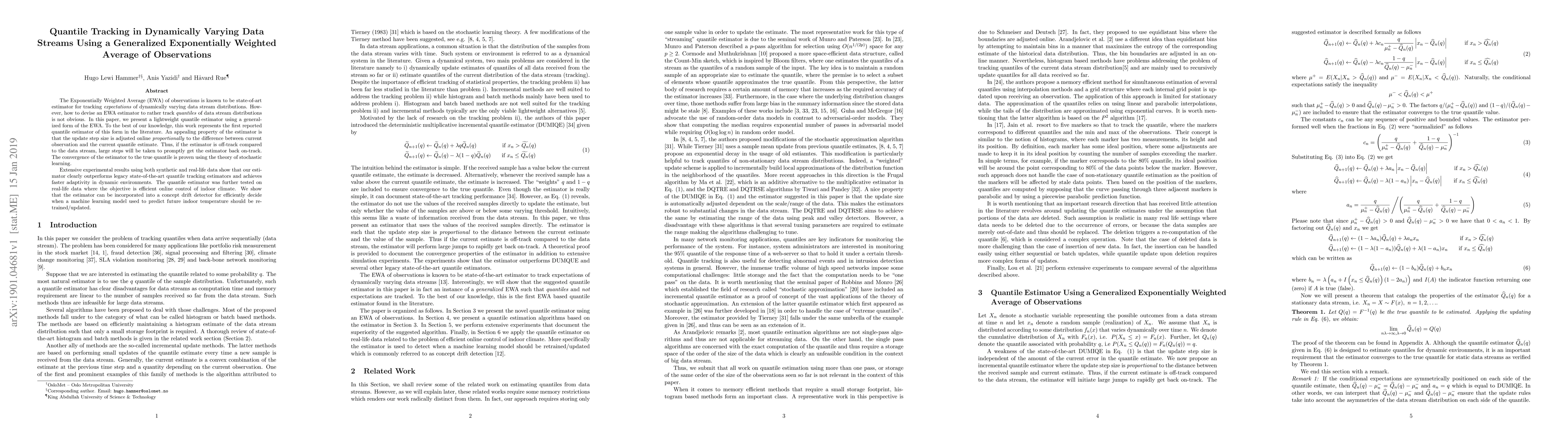 The Exponentially Weighted Average (EWA) of observations is known to be state-of-art estimator for tracking expectations of dynamically varying data stream distributions. However, how to devise an EWA estimator to rather track quantiles of data stream distributions is not obvious. In this paper, we present a lightweight quantile estimator using a generalized form of the EWA. To the best of our knowledge, this work represents the first reported quantile estimator of this form in the literature. An appealing property of the estimator is that the update step size is adjusted online proportionally to the difference between current observation and the current quantile estimate. Thus, if the estimator is off-track compared to the data stream, large steps will be taken to promptly get the estimator back on-track. The convergence of the estimator to the true quantile is proven using the theory of stochastic learning. Extensive experimental results using both synthetic and real-life data show that our estimator clearly outperforms legacy state-of-the-art quantile tracking estimators and achieves faster adaptivity in dynamic environments. The quantile estimator was further tested on real-life data where the objective is efficient online control of indoor climate. We show that the estimator can be incorporated into a concept drift detector for efficiently decide when a machine learning model used to predict future indoor temperature should be retrained/updated.