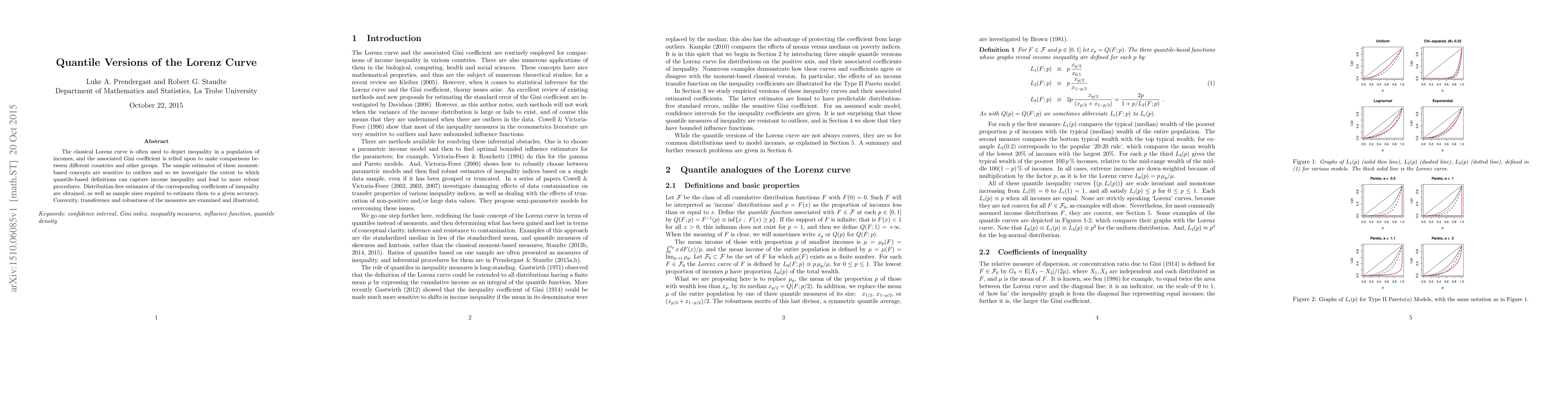 The classical Lorenz curve is often used to depict inequality in a population of incomes, and the associated Gini coefficient is relied upon to make comparisons between different countries and other groups. The sample estimates of these moment-based concepts are sensitive to outliers and so we investigate the extent to which quantile-based definitions can capture income inequality and lead to more robust procedures. Distribution-free estimates of the corresponding coefficients of inequality are obtained, as well as sample sizes required to estimate them to a given accuracy. Convexity, transference and robustness of the measures are examined and illustrated.