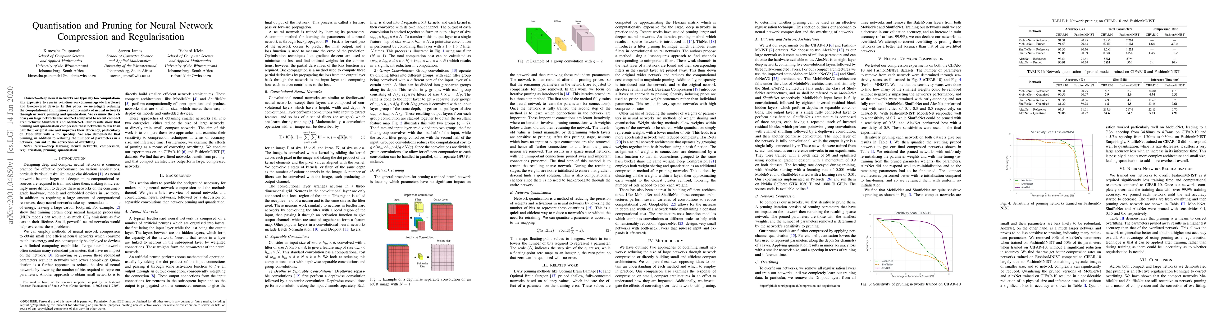Deep neural networks are typically too computationally expensive to run in real-time on consumer-grade hardware and low-powered devices. In this paper, we investigate reducing the computational and memory requirements of neural networks through network pruning and quantisation. We examine their efficacy on large networks like AlexNet compared to recent compact architectures: ShuffleNet and MobileNet. Our results show that pruning and quantisation compresses these networks to less than half their original size and improves their efficiency, particularly on MobileNet with a 7x speedup. We also demonstrate that pruning, in addition to reducing the number of parameters in a network, can aid in the correction of overfitting.
