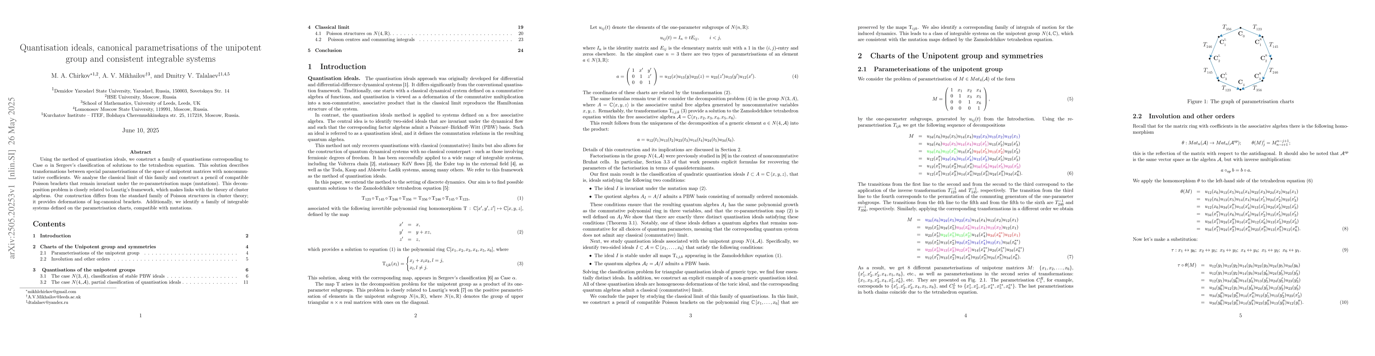 Using the methods of quantisation ideals, we construct a family of quantisations corresponding to Case alpha in Sergeev's classification of solutions to the tetrahedron equation. This solution describes transformations between special parametrisations of the space of unipotent matrices with noncommutative coefficients. We analyse the classical limit of this family and construct a pencil of compatible Poisson brackets that remain invariant under the re-parametrisation maps (mutations). This decomposition problem is closely related to Lusztig's framework, which makes links with the theory of cluster algebras. Our construction differs from the standard family of Poisson structures in cluster theory; it provides deformations of log-canonical brackets. Additionally, we identify a family of integrable systems defined on the parametrisation charts, compatible with mutations.