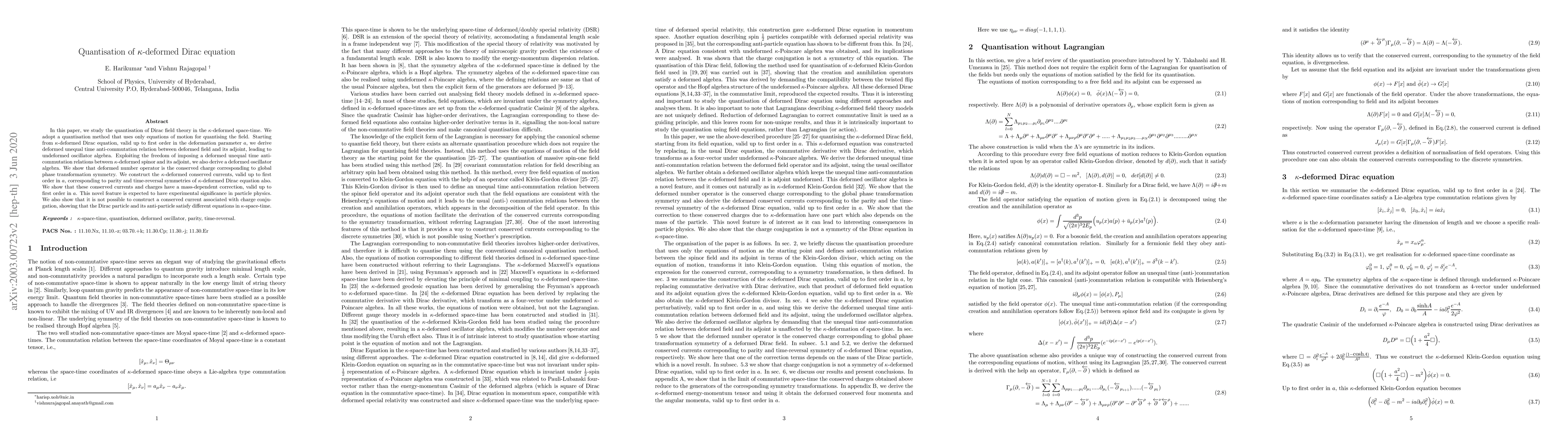This paper quantizes the Dirac field theory in $\kappa$-deformed space-time, deriving deformed unequal time anti-commutation relations and a deformed oscillator algebra. It finds mass-dependent corrections to conserved currents and charges, indicating potential experimental implications in particle physics.