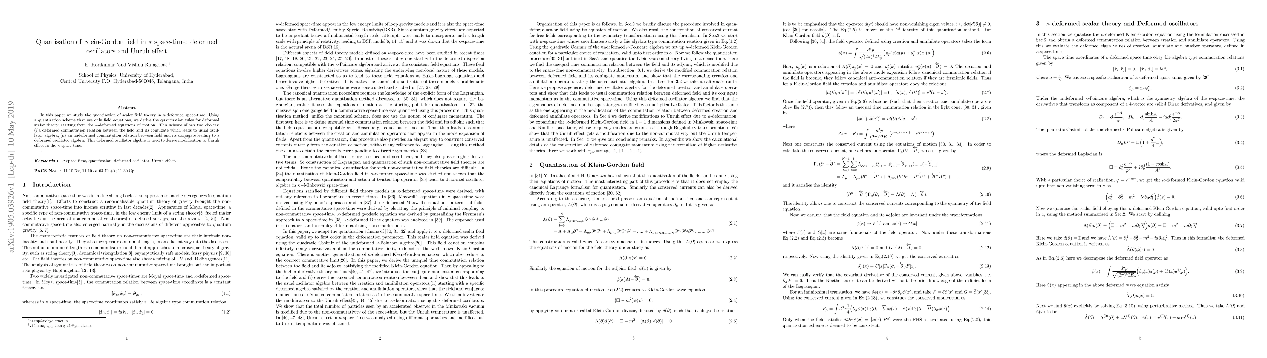 This paper quantizes the Klein-Gordon field in $\kappa$-deformed space-time, deriving quantization rules from $\kappa$-deformed equations of motion. It introduces a deformed oscillator algebra that modifies the Unruh effect in this space-time.
