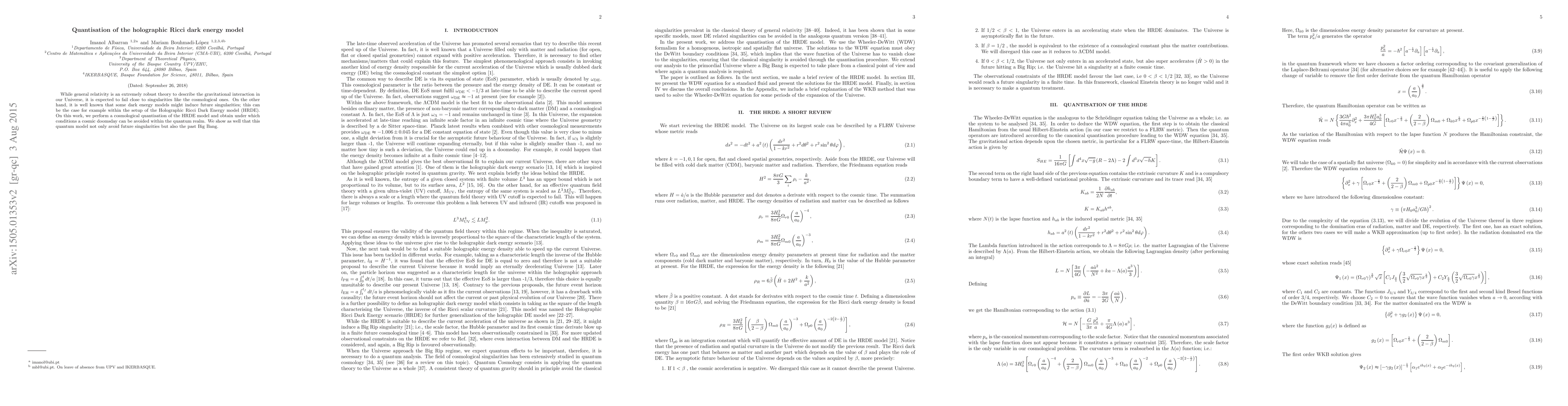 This paper quantizes the Holographic Ricci Dark Energy model to explore conditions under which future singularities and the past Big Bang singularity can be avoided in the quantum realm. The results suggest that the quantum version of the model can prevent both future singularities and the initial Big Bang singularity.