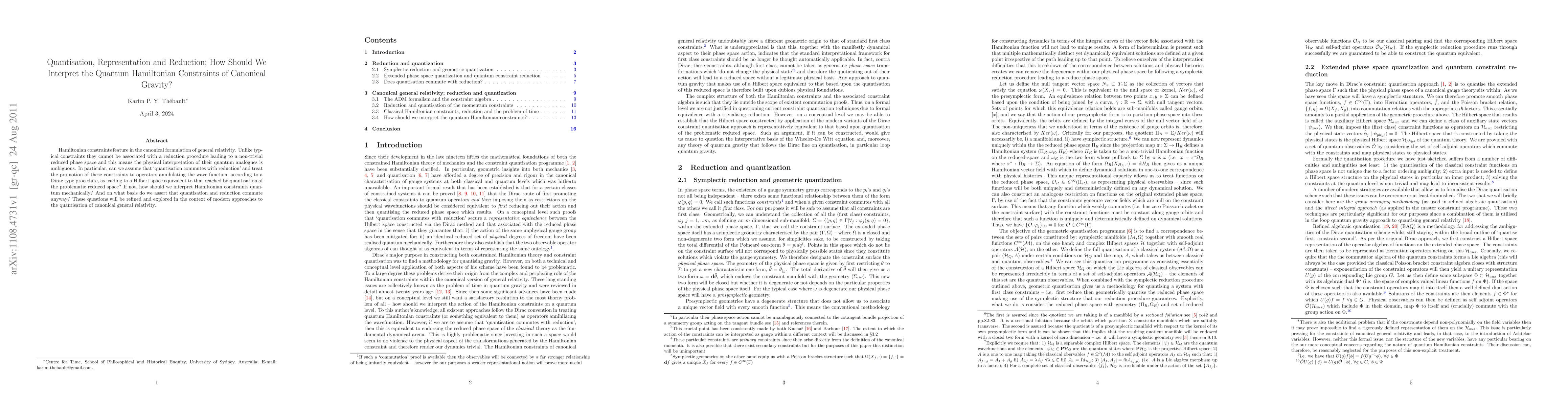 The paper explores the quantum interpretation of Hamiltonian constraints in canonical gravity, questioning whether quantization commutes with reduction and proposing new approaches for a more accurate understanding.