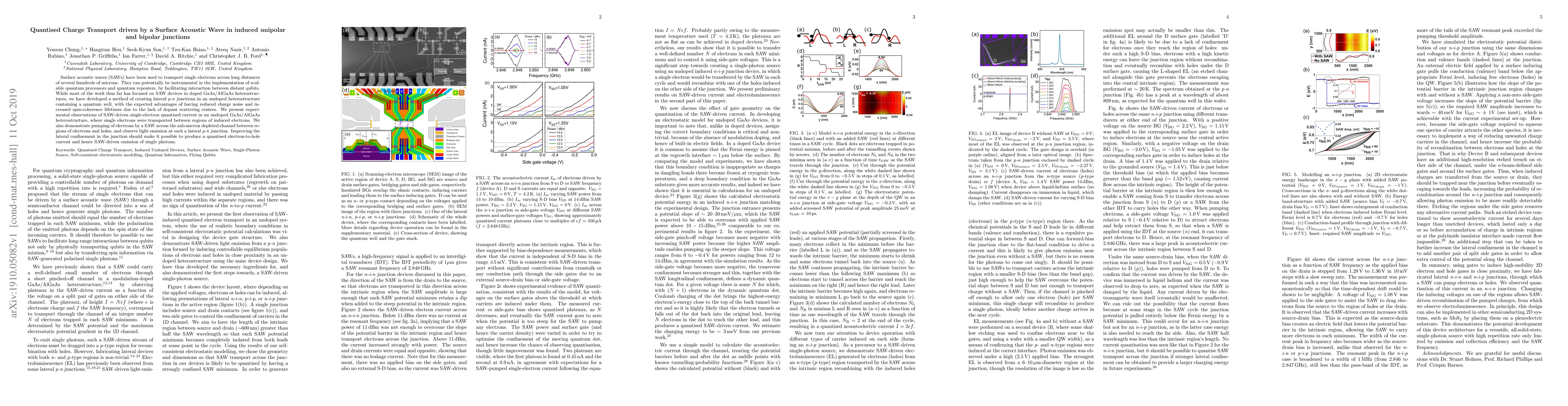 This paper explores the use of surface acoustic waves (SAWs) to transport single electrons in undoped GaAs/AlGaAs heterostructures, demonstrating quantized charge transport in both unipolar and bipolar junctions, with potential for scalable quantum processors and quantum repeaters. The study also shows light emission at lateral p-n junctions, suggesting future applications in photon emission.