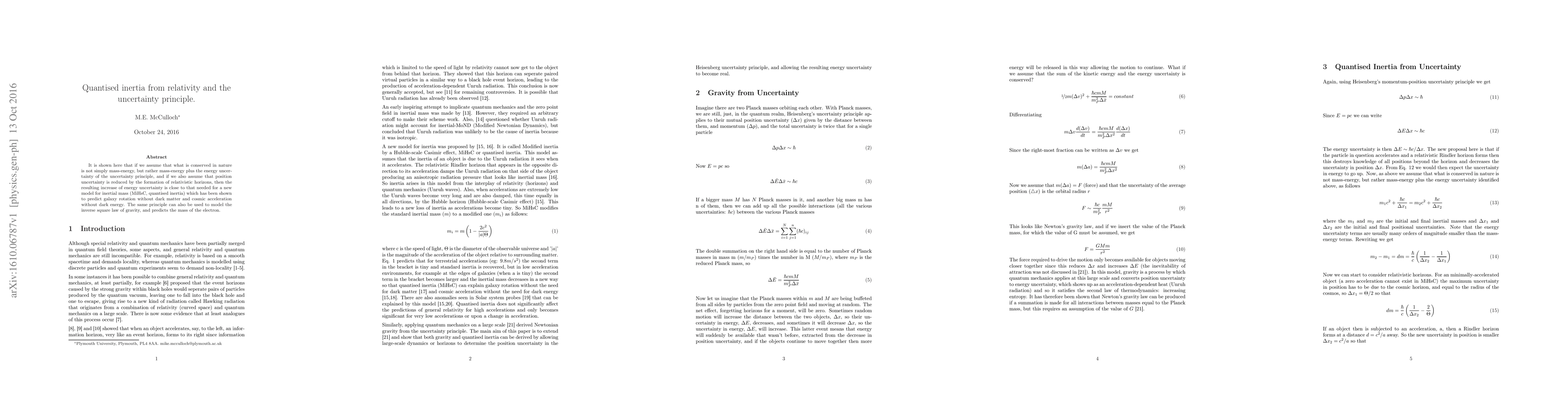 It is shown here that if we assume that what is conserved in nature is not simply mass-energy, but rather mass-energy plus the energy uncertainty of the uncertainty principle, and if we also assume that position uncertainty is reduced by the formation of relativistic horizons, then the resulting increase of energy uncertainty is close to that needed for a new model for inertial mass (MiHsC, quantised inertia) which has been shown to predict galaxy rotation without dark matter and cosmic acceleration without dark energy. The same principle can also be used to model the inverse square law of gravity, and predicts the mass of the electron.