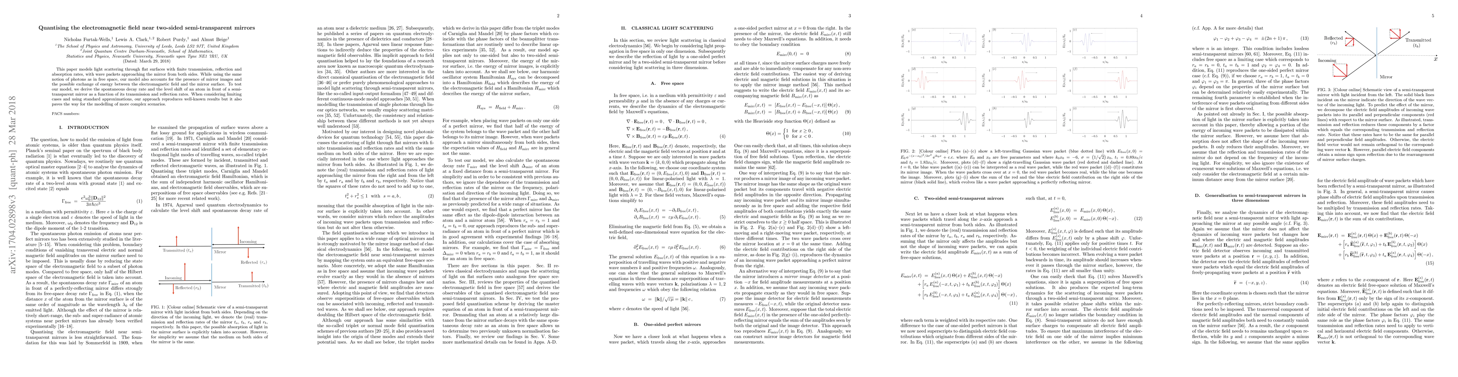This paper quantises the electromagnetic field near two-sided semi-transparent mirrors, modelling light scattering with finite transmission, reflection, and absorption rates. It derives the spontaneous decay rate and level shift of an atom in front of such a mirror, reproducing known results and enabling modelling of more complex scenarios.