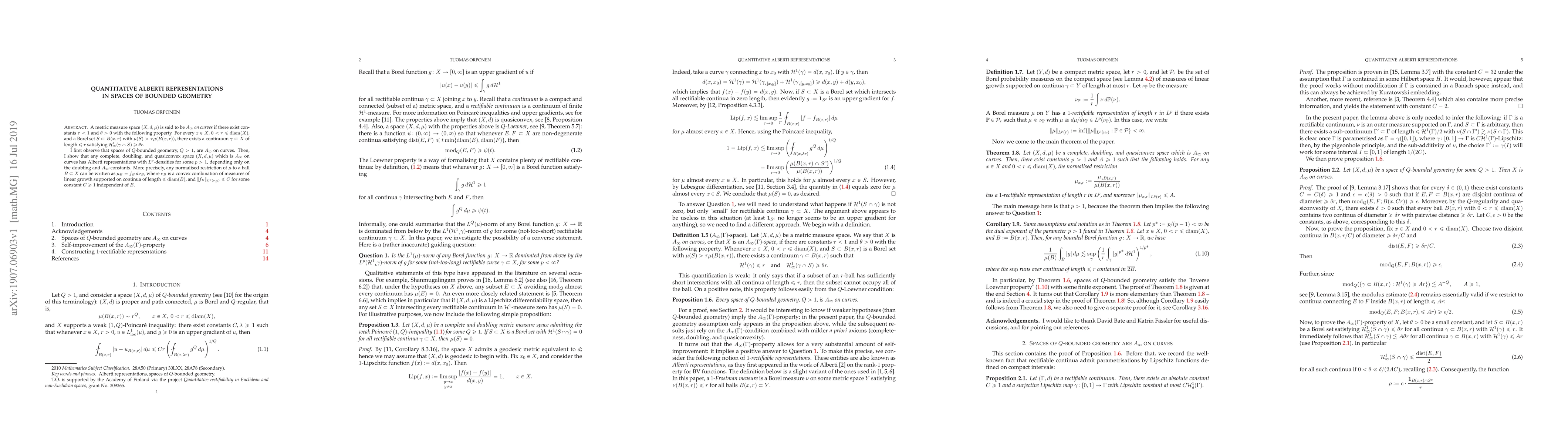 This research establishes that spaces of Q-bounded geometry are A_∞ on curves, and for complete, doubling, and quasiconvex spaces that are A_∞ on curves, it demonstrates the existence of Alberti representations with L^p-densities for some p > 1, dependent on doubling and A_∞ constants. This implies that normalized restrictions of μ to a ball B in X can be expressed as μ_B = f_B dν_B, where ν_B is a convex combination of measures with linear growth supported on continua of length ≤ diam(B), with ∥f_B∥_L^p(ν_B) ≤ C, independent of B.