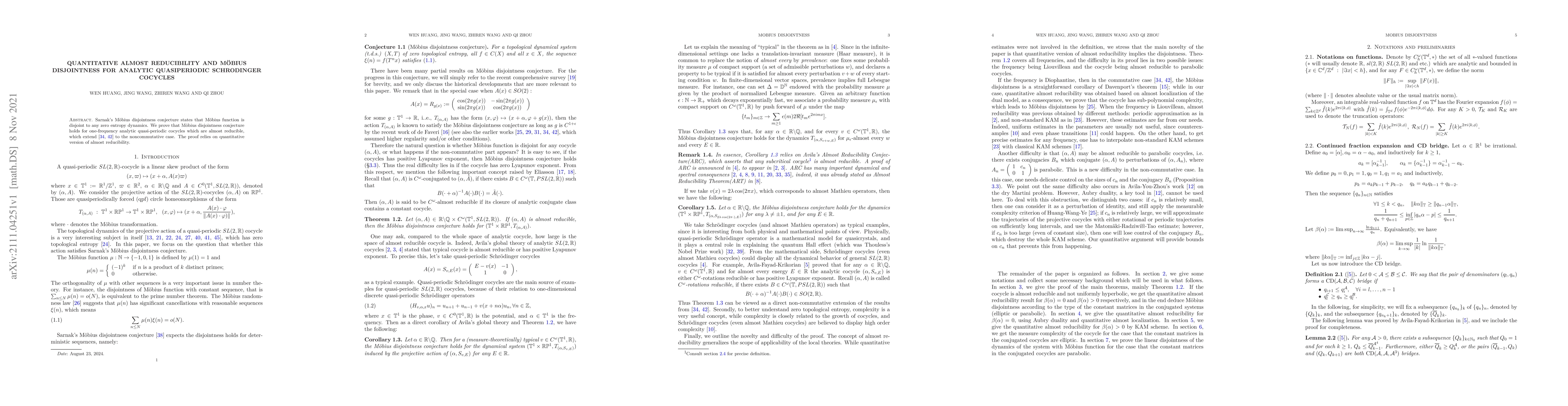 Sarnak's M\"obius disjointness conjecture states that M\"obius function is disjoint to any zero entropy dynamics. We prove that M\"obius disjointness conjecture holds for one-frequency analytic quasi-periodic cocycles which are almost reducible, which extend \cite{LS15,W17} to the noncommutative case. The proof relies on quantitative version of almost reducibility.