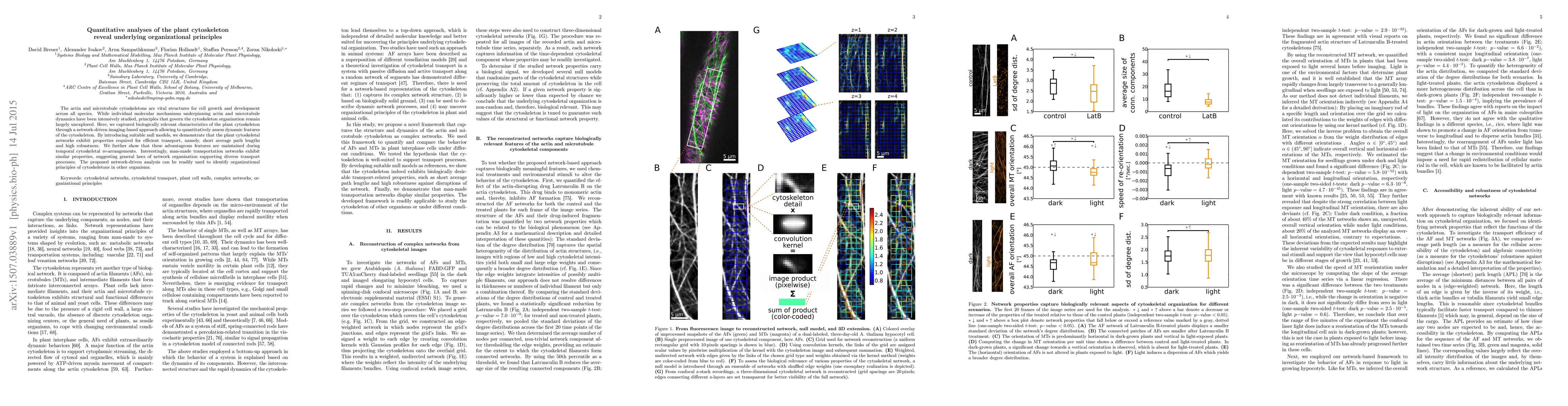 The actin and microtubule cytoskeletons are vital structures for cell growth and development across all species. While individual molecular mechanisms underpinning actin and microtubule dynamics have been intensively studied, principles that govern the cytoskeleton organization remain largely unexplored. Here, we captured biologically relevant characteristics of the plant cytoskeleton through a network-driven imaging-based approach allowing to quantitatively assess dynamic features of the cytoskeleton. By introducing suitable null models, we demonstrate that the plant cytoskeletal networks exhibit properties required for efficient transport, namely, short average path lengths and high robustness. We further show that these advantageous features are maintained during temporal cytoskeletal re-arrangements. Interestingly, man-made transportation networks exhibit similar properties, suggesting general laws of network organization supporting diverse transport processes. The proposed network-driven analysis can be readily used to identify organizational principles of cytoskeletons in other organisms.