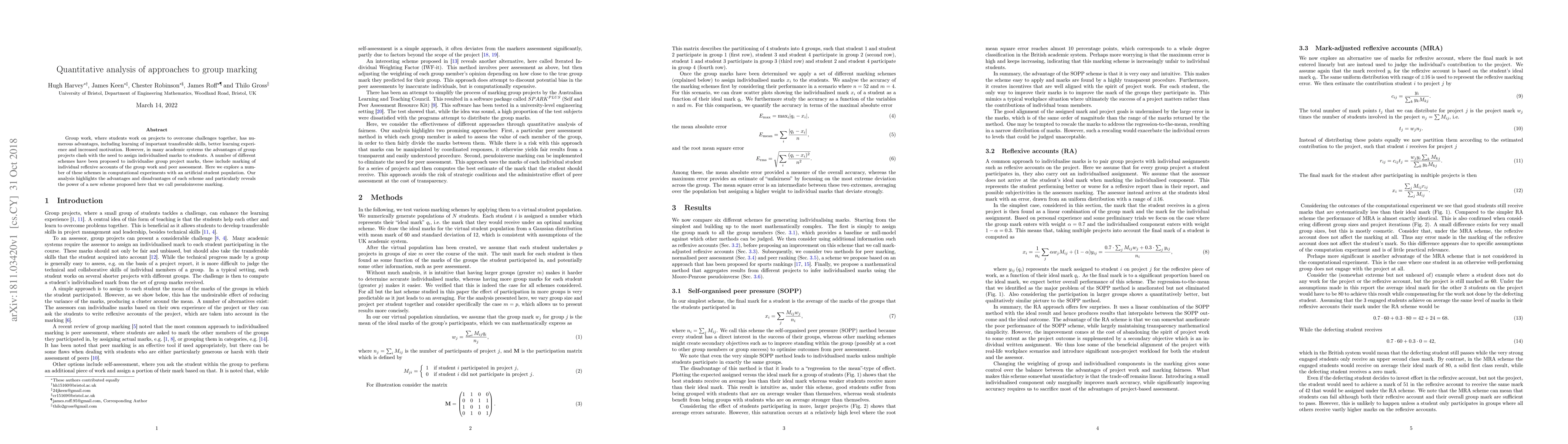 Group work, where students work on projects to overcome challenges together, has numerous advantages, including learning of important transferable skills, better learning experience and increased motivation. However, in many academic systems the advantages of group projects clash with the need to assign individualised marks to students. A number of different schemes have been proposed to individualise group project marks, these include marking of individual reflexive accounts of the group work and peer assessment. Here we explore a number of these schemes in computational experiments with an artificial student population. Our analysis highlights the advantages and disadvantages of each scheme and particularly reveals the power of a new scheme proposed here that we call pseudoinverse marking.