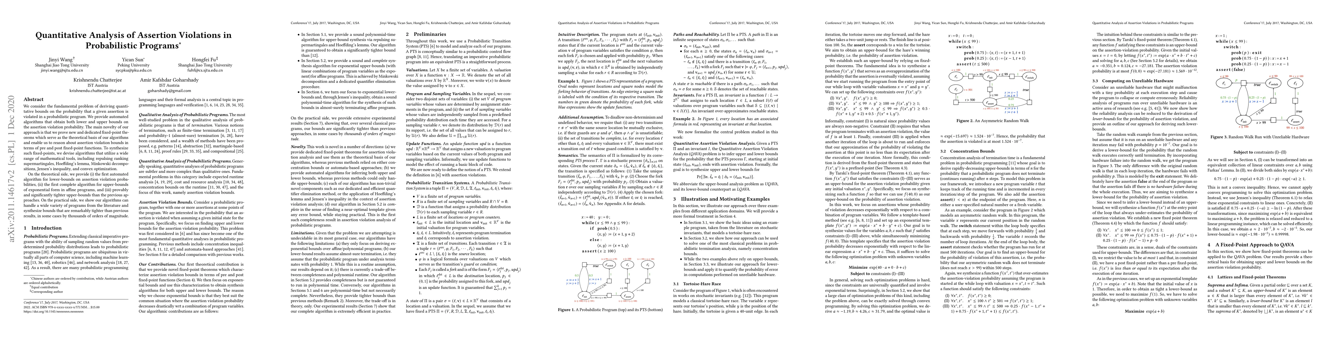 This paper presents automated algorithms for deriving quantitative bounds on assertion violation probabilities in probabilistic programs, utilizing novel fixed-point theorems and mathematical tools. The algorithms achieve tighter bounds compared to previous methods and can handle a diverse range of programs.