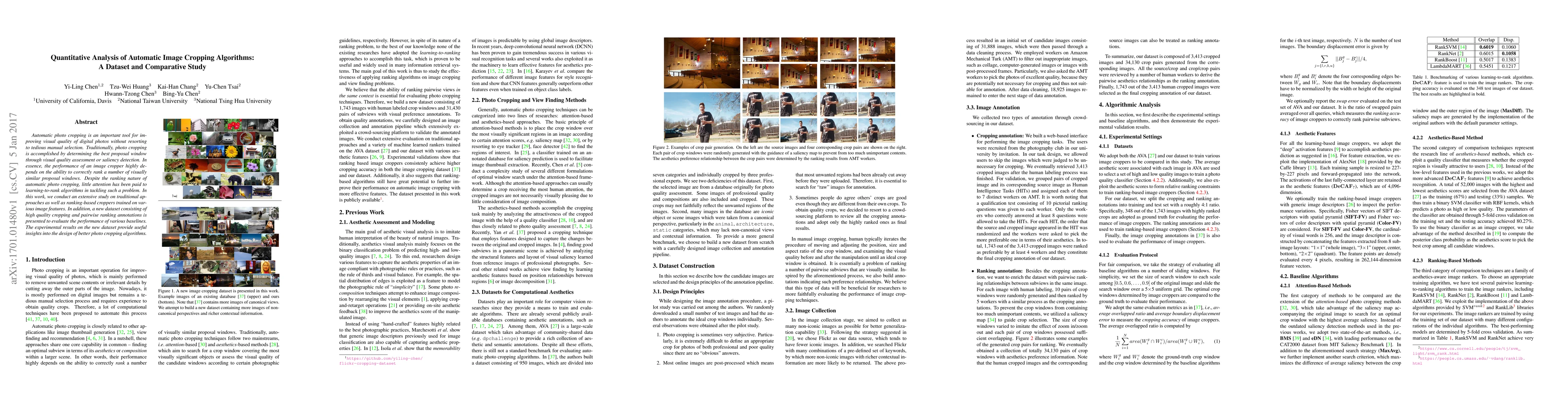 This paper presents an extensive comparative study on automatic image cropping algorithms, focusing on both traditional and learning-to-rank approaches. It introduces a new dataset with high-quality cropping and ranking annotations to evaluate various baselines, providing insights for developing improved photo cropping methods.
