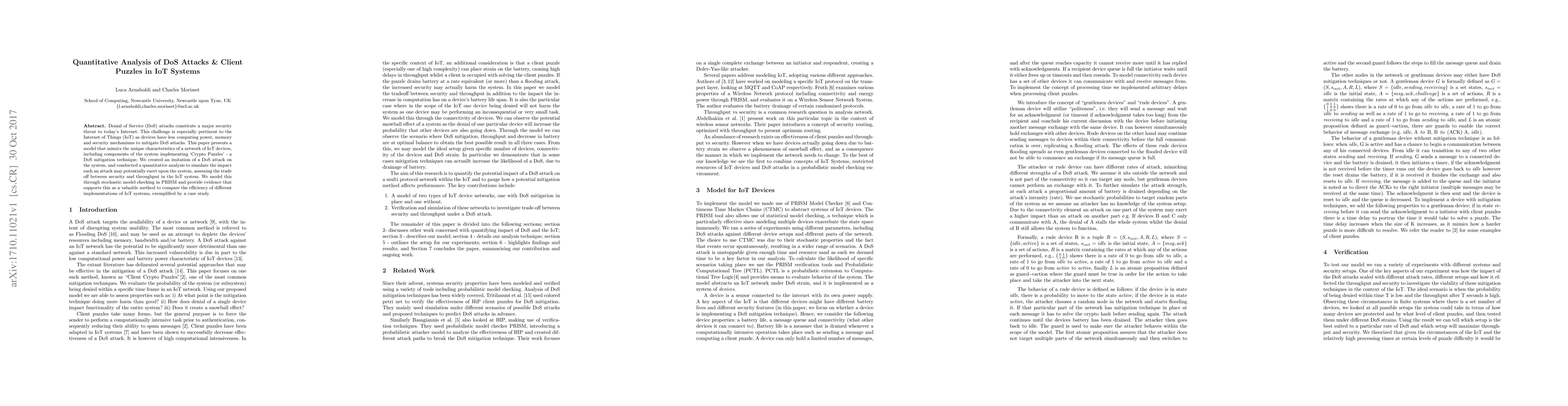 Denial of Service (DoS) attacks constitute a major security threat to today's Internet. This challenge is especially pertinent to the Internet of Things (IoT) as devices have less computing power, memory and security mechanisms to mitigate DoS attacks. This paper presents a model that mimics the unique characteristics of a network of IoT devices, including components of the system implementing `Crypto Puzzles' - a DoS mitigation technique. We created an imitation of a DoS attack on the system, and conducted a quantitative analysis to simulate the impact such an attack may potentially exert upon the system, assessing the trade off between security and throughput in the IoT system. We model this through stochastic model checking in PRISM and provide evidence that supports this as a valuable method to compare the efficiency of different implementations of IoT systems, exemplified by a case study.