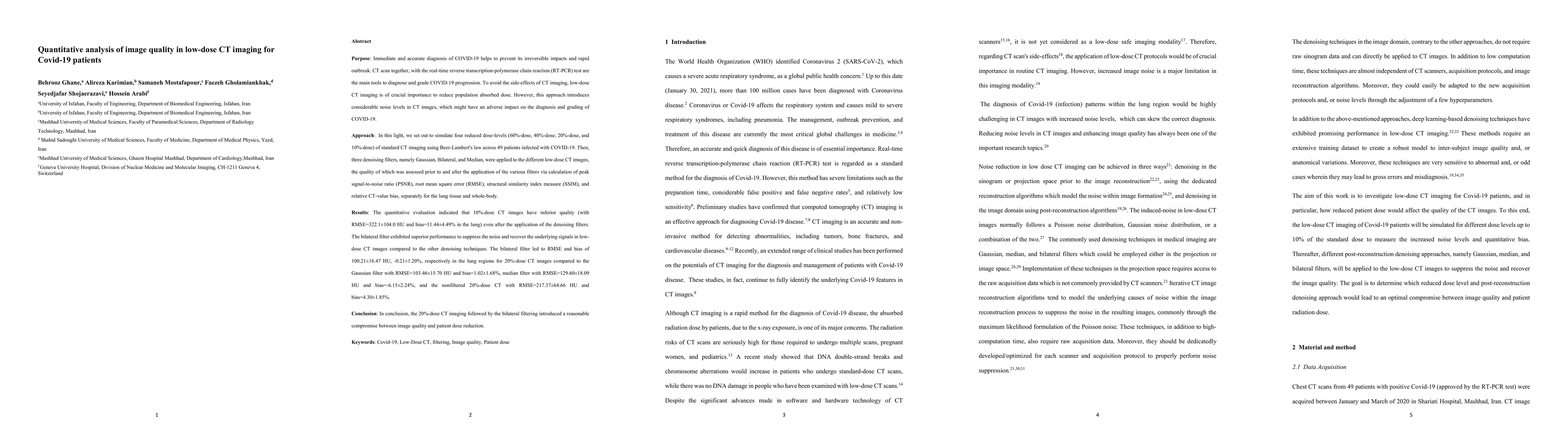 This study quantitatively analyzed the image quality of low-dose CT scans for COVID-19 patients, finding that 10%-dose images had significantly inferior quality even after denoising. The bilateral filter outperformed Gaussian and median filters in reducing noise while preserving image details, achieving the best results for 20%-dose CT images.