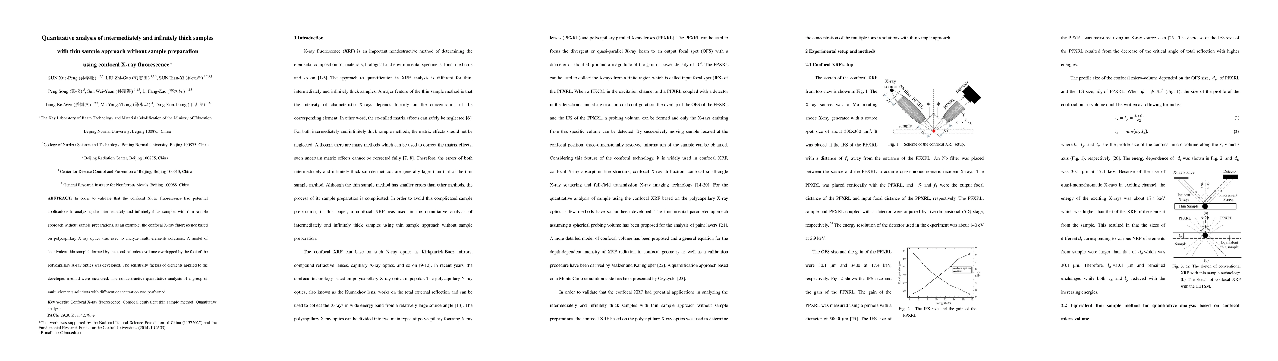 In order to validate that the confocal X-ray fluorescence had potential applications in analyzing the intermediately and infinitely thick samples with thin sample approach without sample preparations, as an example, the confocal X-ray fluorescence based on polycapillary X-ray optics was used to analyze multi elements solutions.