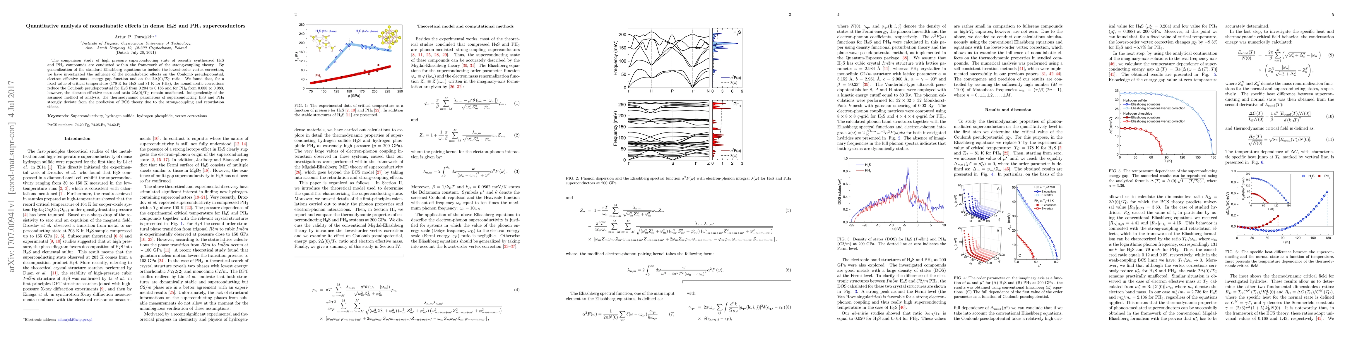 The comparison study of high pressure superconducting state of recently synthesized H$_3$S and PH$_3$ compounds are conducted within the framework of the strong-coupling theory. By generalization of the standard Eliashberg equations to include the lowest-order vertex correction, we have investigated the influence of the nonadiabatic effects on the Coulomb pseudopotential, electron effective mass, energy gap function and on the $2\Delta(0)/T_C$ ratio. We found that, for a fixed value of critical temperature ($178$ K for H$_3$S and $81$ K for PH$_3$), the nonadiabatic corrections reduce the Coulomb pseudopotential for H$_3$S from $0.204$ to $0.185$ and for PH$_3$ from $0.088$ to $0.083$, however, the electron effective mass and ratio $2\Delta(0)/T_C$ remain unaffected. Independently of the assumed method of analysis, the thermodynamic parameters of superconducting H$_3$S and PH$_3$ strongly deviate from the prediction of BCS theory due to the strong-coupling and retardation effects.