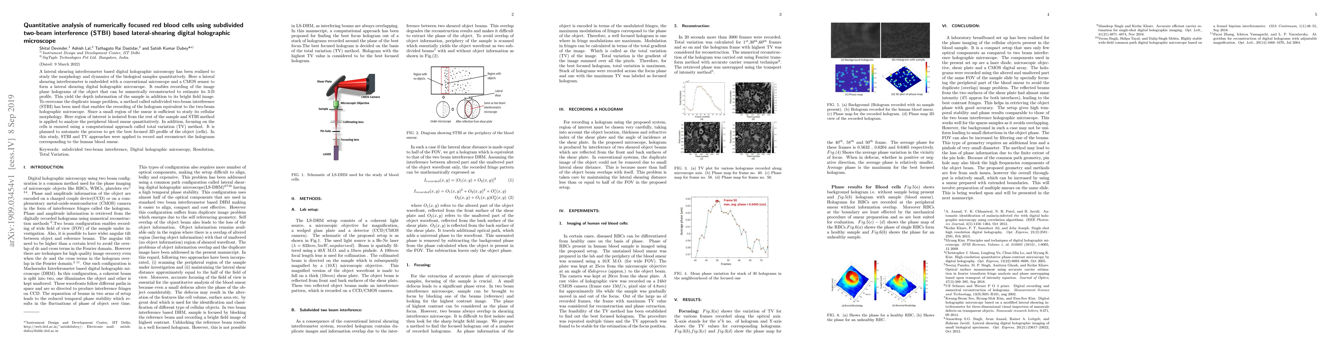 A lateral shear interferometer based digital holographic microscopy has been realized to study the morphology dynamics of Human red blood cells quantitatively. Here, a lateral shear interferometer is embedded with a conventional microscope with a CMOS sensor to form a lateral-shearing digital holographic microscope. It enables recording of image plane holograms of objects that can be numerically reconstructed to estimate its3-D prole. This yields the depth information of the sample in addition to its bright field image. The problem of the duplicate image is addressed by filtering object information from one of the beams, without losing the contrast in the fringes. The contrast in the fringes is maintained by increased reflectivity of the back surface of the shear plate. This improves the resolution in the proposed system.