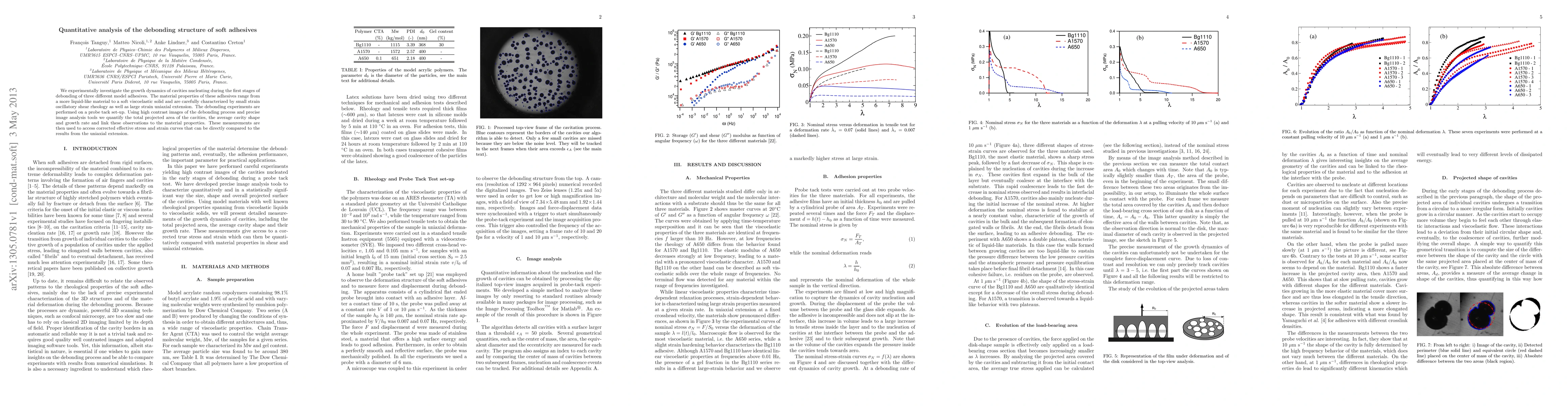 This paper investigates the initial stages of debonding in three model adhesives with varying material properties, employing probe tack tests and high-contrast imaging to quantify cavity growth dynamics. The study correlates cavity characteristics with the adhesives' rheological properties, providing insights into effective stress and strain curves.