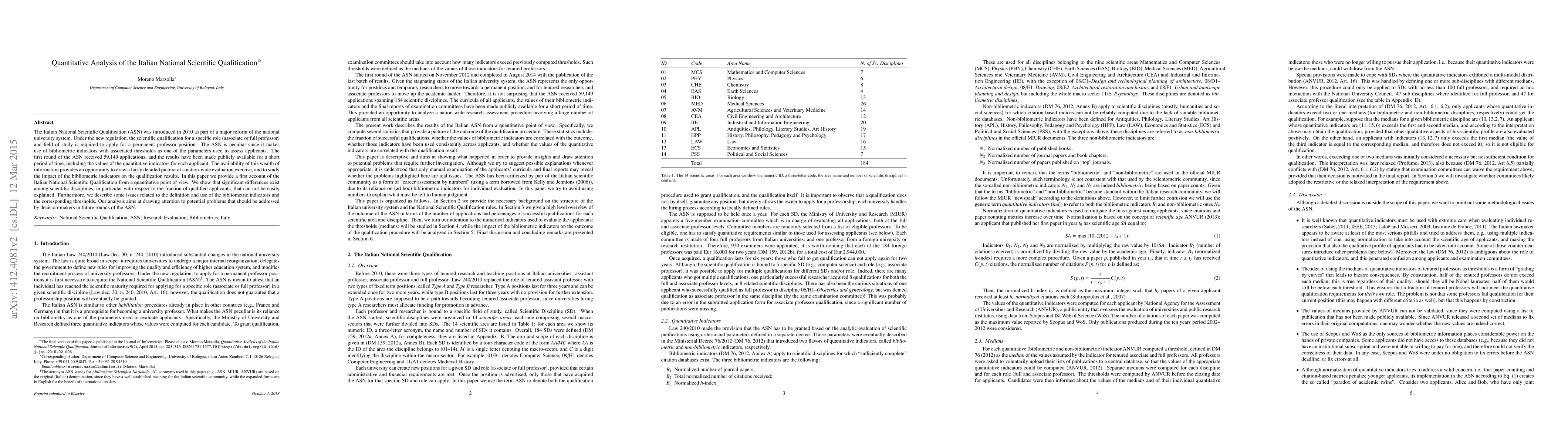 This paper quantitatively analyzes the Italian National Scientific Qualification (ASN), introduced in 2010 to assess university professors, revealing significant differences among scientific disciplines in qualification rates and highlighting issues with bibliometric indicators and thresholds. The study aims to inform future reforms by identifying potential problems in the evaluation process.