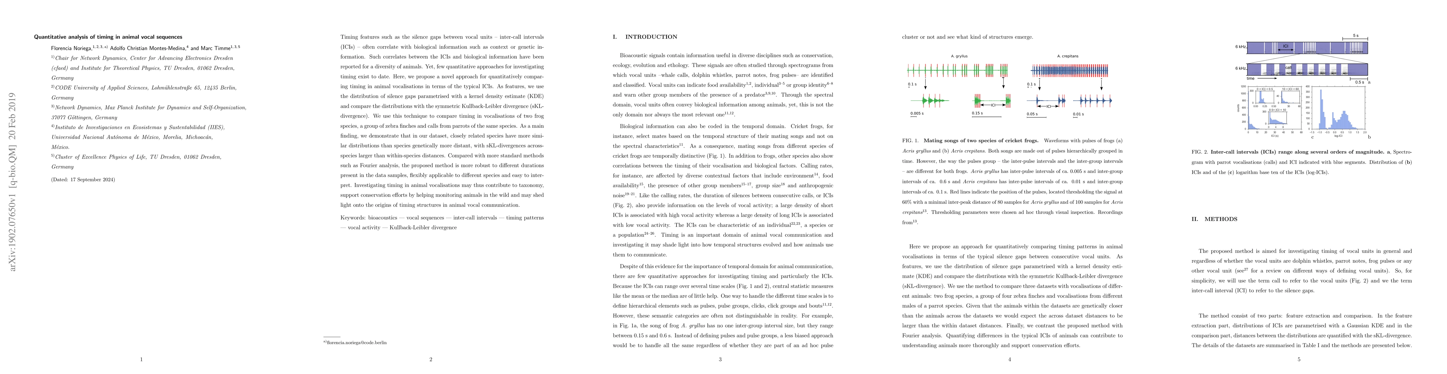 Timing features such as the silence gaps between vocal units -- inter-call intervals (ICIs) -- often correlate with biological information such as context or genetic information. Such correlates between the ICIs and biological information have been reported for a diversity of animals. Yet, few quantitative approaches for investigating timing exist to date. Here, we propose a novel approach for quantitatively comparing timing in animal vocalisations in terms of the typical ICIs. As features, we use the distribution of silence gaps parametrised with a kernel density estimate (KDE) and compare the distributions with the symmetric Kullback-Leibler divergence (sKL-divergence). We use this technique to compare timing in vocalisations of two frog species, a group of zebra finches and calls from parrots of the same species. As a main finding, we demonstrate that in our dataset, closely related species have more similar distributions than species genetically more distant, with sKL-divergences across-species larger than within-species distances. Compared with more standard methods such as Fourier analysis, the proposed method is more robust to different durations present in the data samples, flexibly applicable to different species and easy to interpret. Investigating timing in animal vocalisations may thus contribute to taxonomy, support conservation efforts by helping monitoring animals in the wild and may shed light onto the origins of timing structures in animal vocal communication.