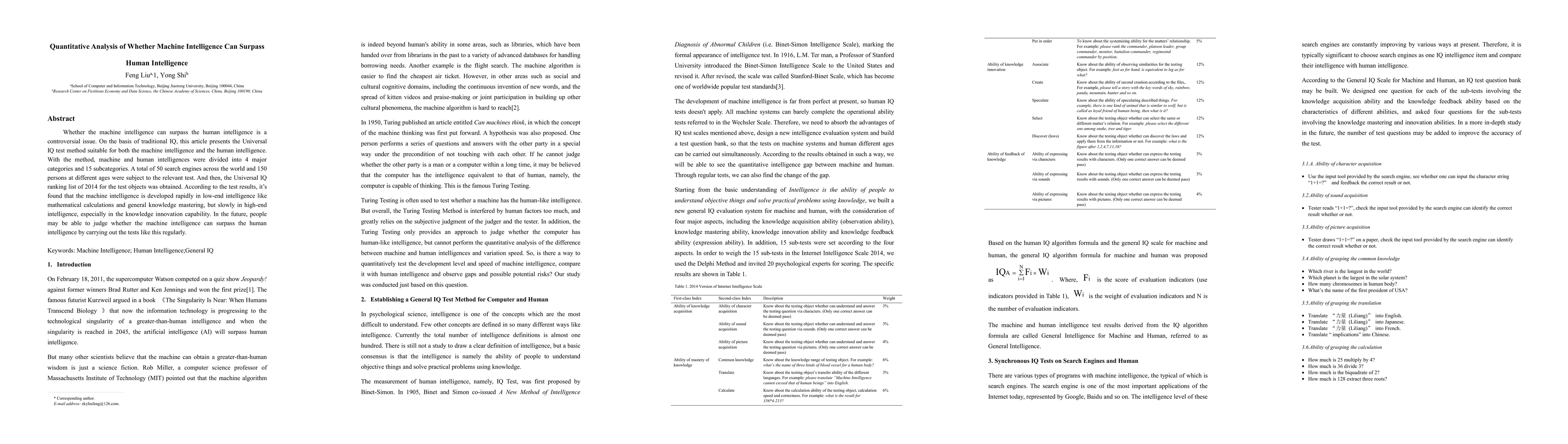 This paper proposes a Universal IQ test method to compare machine and human intelligence, categorizing them into 4 major types and 15 subcategories. It tests 50 global search engines and 150 individuals, producing a 2014 Universal IQ ranking list to analyze the potential for machine intelligence to surpass human intelligence.