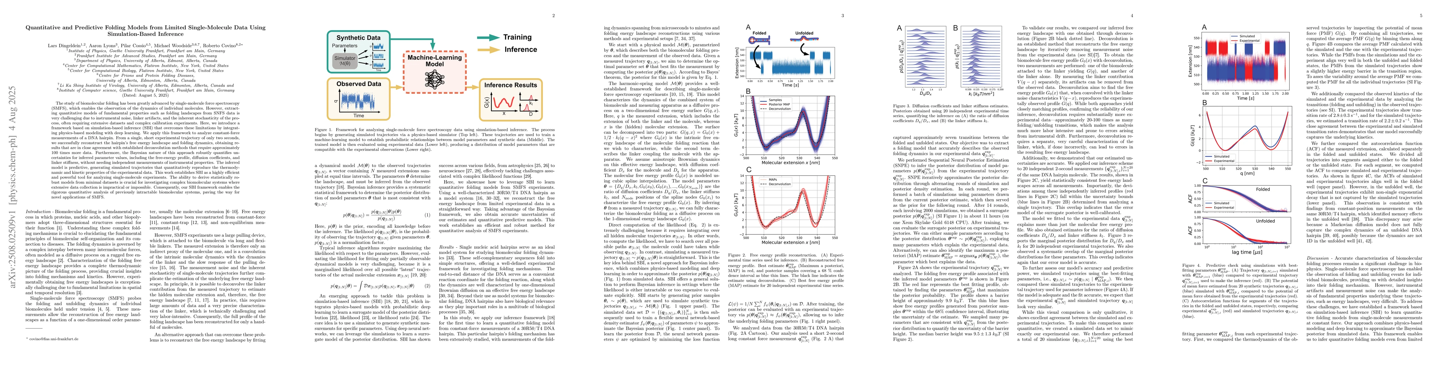 The study of biomolecular folding has been greatly advanced by single-molecule force spectroscopy (SMFS), which enables the observation of the dynamics of individual molecules. However, extracting quantitative models of fundamental properties such as folding landscapes from SNFS data is very challenging due to instrumental noise, linker artifacts, and the inherent stochasticity of the process, often requiring extensive datasets and complex calibration experiments. Here, we introduce a framework based on simulation-based inference (SBI) that overcomes these limitations by integrating physics-based modeling with deep learning. We apply this framework to analyze constant-force measurements of a DNA hairpin. From a single, short experimental trajectory of only two seconds, we successfully reconstruct the hairpin's free energy landscape and folding dynamics, obtaining results that are in close agreement with established deconvolution methods that require approximately 100 times more data. Furthermore, the Bayesian nature of this approach robustly quantifies uncertainties for inferred parameter values, including the free-energy profile, diffusion coefficients, and linker stiffness, without needing independent measurements of instrumental properties. The inferred model is predictive, generating simulated trajectories that quantitatively reproduce the thermodynamic and kinetic properties of the experimental data. This work establishes SBI as a highly efficient and powerful tool for analyzing single-molecule experiments. The ability to derive statistically robust models from minimal datasets is crucial for investigating complex biomolecular systems where extensive data collection is impractical or impossible. Consequently, our SBI framework enables the rigorous quantitative analysis of previously intractable biomolecular systems, paving the way for novel applications of SMFS.