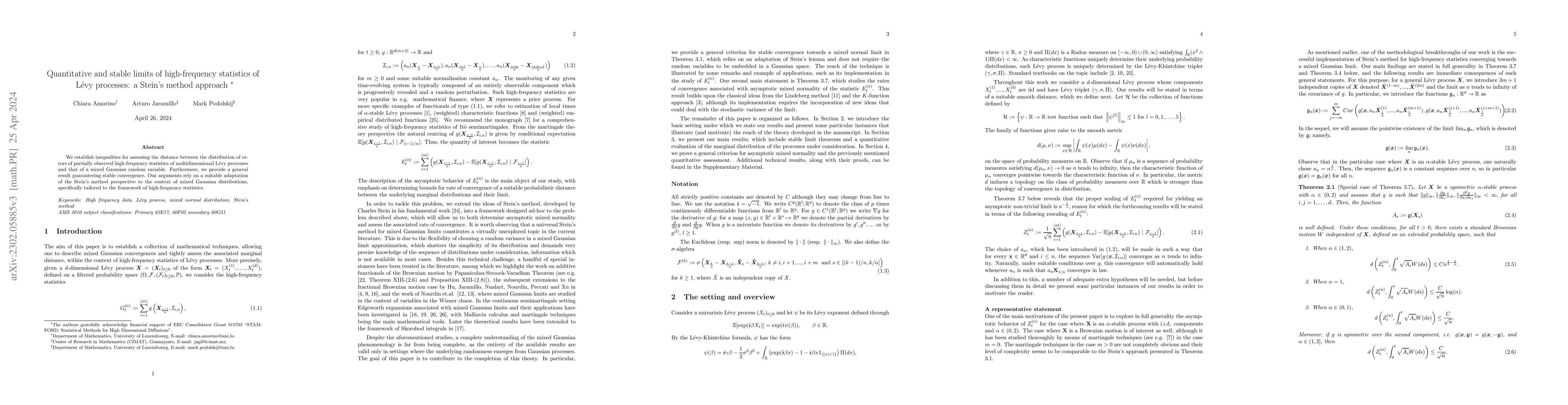 This paper develops inequalities using Stein's method to assess the convergence of high-frequency statistics of multidimensional Lévy processes to mixed Gaussian distributions, ensuring stable functional convergence in the process.